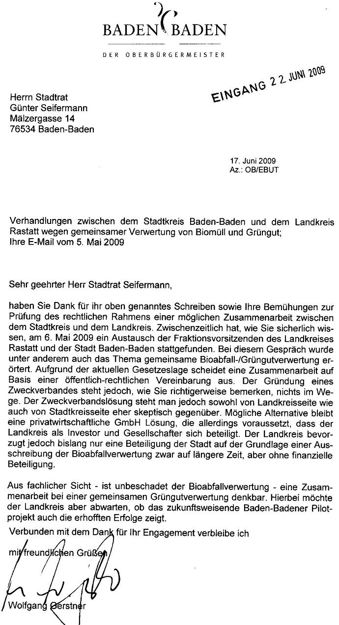 Mein Antrag zur Aufnahme von Verhandlungen zwischen Baden-Baden und dem Landkreis Rastatt wegen gemeinsamer Verwertung von Biomüll und Grüngut vom 12.02.09 / Ihre Zwischennachricht vom 04. März 09