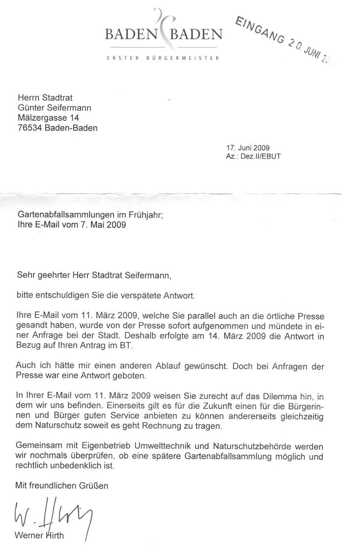 Erfolg hatte der bündnisgrüne Stadt-u.Ortschaftsrat Günter Seifermann mit seiner Forderung nach einer Optimierung der Gartenabfall sammlung im Frühjahr. Wie ihm von Bürgermeister Hirth mit Schreiben vom 17. Juni 2009 zugesagt, stimmte der gemeinderätliche Bau/Umweltausschuss am 15.07.09 der Einführung einer zusätzlichen Gartenabfallsammlung (Sommersammlung) zu. Damit seien die Sammeltermine besser mit dem Stand der Vegetation in Einklang zu bringen. Seifermann dankte Bgm.Hirth am Schluß der Sitzung für die rasche Lösung. Weiteren Erfolg hatte Seifermann mit seiner Forderung, von der “diskriminierenden” Bezeichnung “Umlandstadtteile” für die Außenstadtteile Rebland, Haueneberstein, Sandweier und Ebersteinburg durch den Fachbetrieb Umwelttechnik endlich abzusehen, weil dieser Begriff für diese Teile der Gesamtstadt in keiner Weise zutreffend ist. OB Gerstner sagte in der Sitzung des Hauptausschusses vom 13. Juli 2009 zu, dass man dieser Forderung ab sofort nachkommen werde.