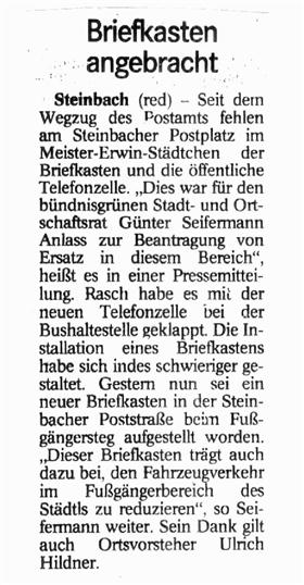 Leider gilt das nicht für den Briefkasten, der seit damals mitten im verkehrsberuhigten Bereich der Steinbacher Straße (Städtl) aufgestellt wurde.