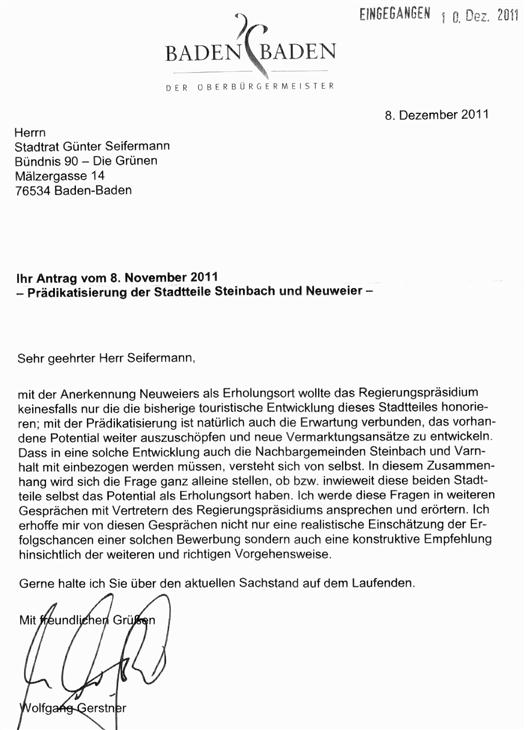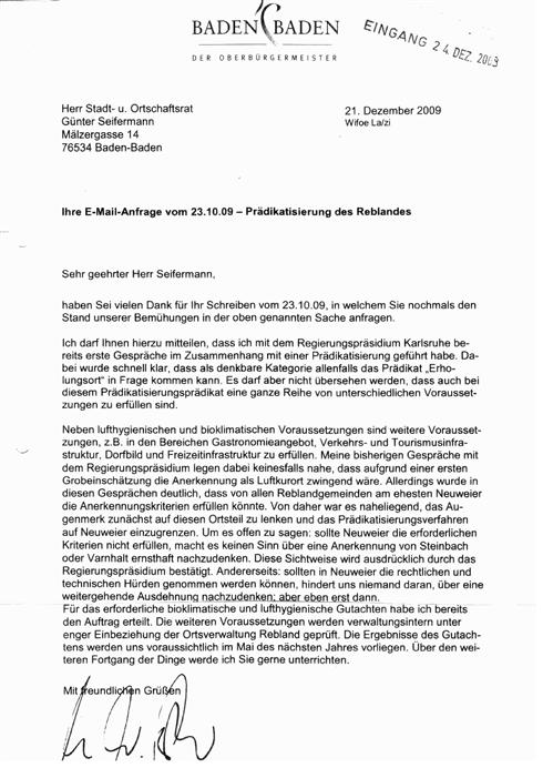 Ich bitte Sie deshalb, über meinen Antrag auf Einleitung des Prädikatisierungsverfahrens vom 29.05.09 zum „Erholungsort“ für das Baden-Badener Rebland in den zuständigen Gremien beraten und abstimmen zu lassen. Die angesichts der von mir nochmals er-