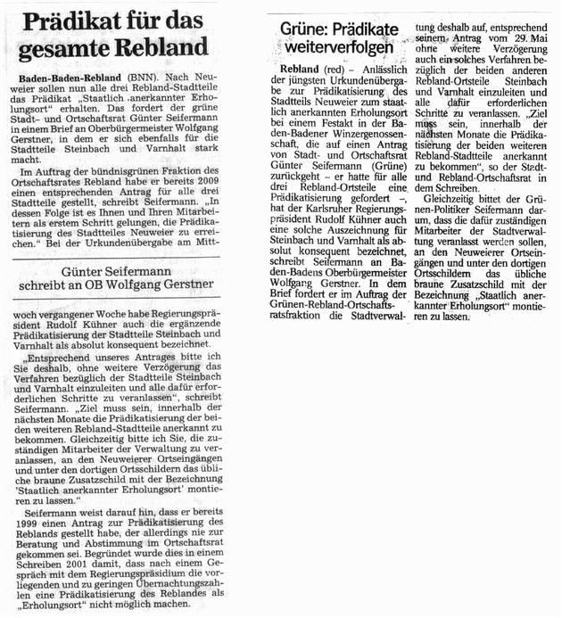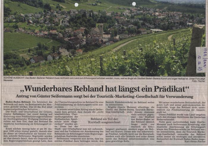 Wir haben damals übereinstimmend festgehalten, dass Frau Goertz-Meissner die gegenüber einem ABB-Pressemitarbeiter gegebenen Antworten wegen Unkenntnis der tatsächlichen Begebenheiten ausdrücklich bedauert. Inzwischen ist geklärt, dass meine Feststellung korrekt ist und das Baden-Badener Rebland derzeit weder das Prädikat „Heilbad“, „Kurort“, „Luftkurort“ noch „Erholungsort“ hat. Um dies nicht noch ausführlich an die Öffentlichkeit zu geben, verzichtete ich auf die Klarstellung des ABB-Berichtes vom 12.06. („Wunderbares Rebland hat längst ein Prädikat“).