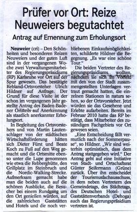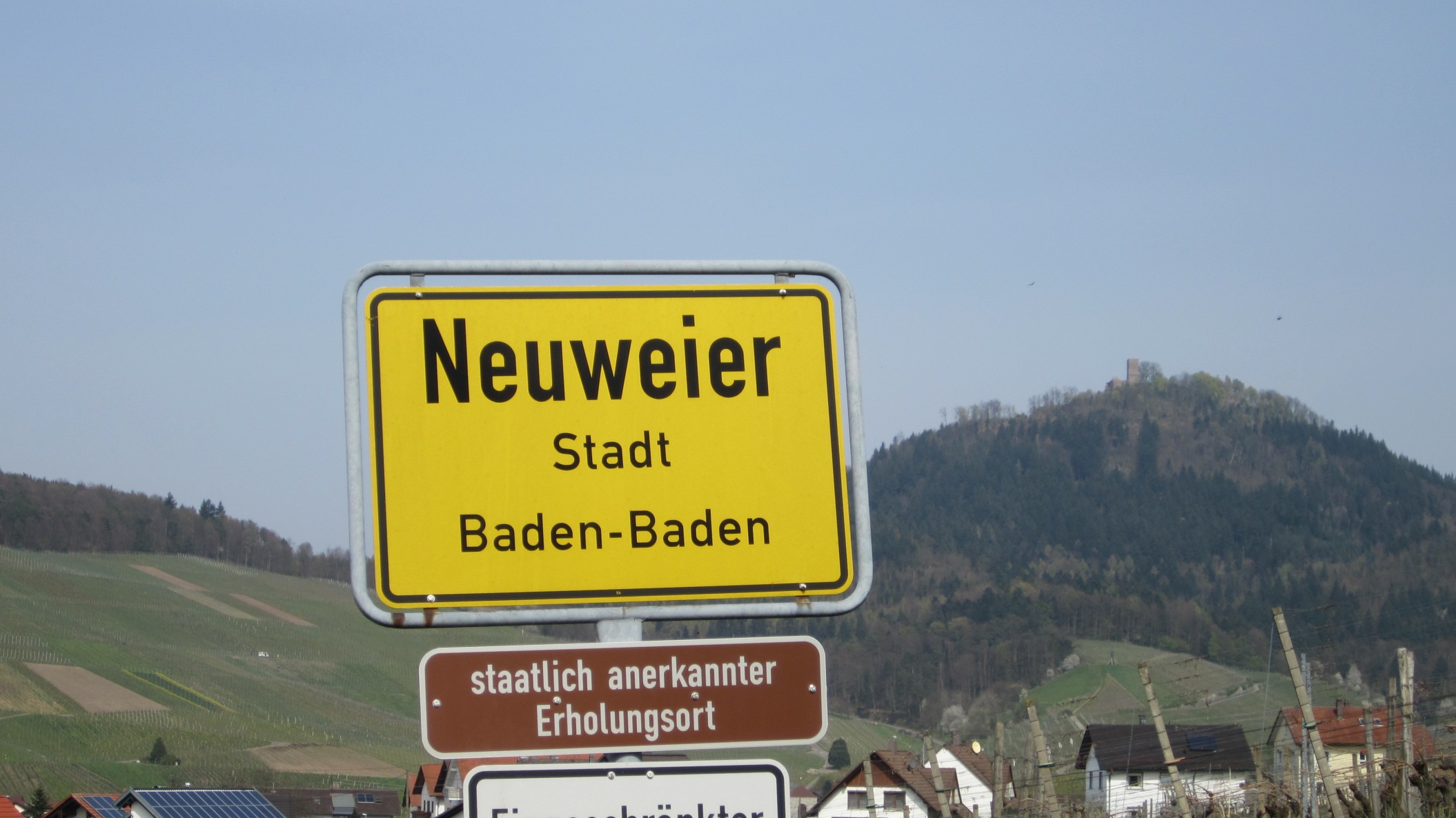 Gleichzeitig bitte ich Sie, die zuständigen Mitarbeiter der Verwaltung zu veranlassen, an den Neuweierer Ortseingängen und unter den dortigen Ortsschildern das übliche braune Zusatzschild mit der Bezeichnung „Staatlich anerkannter Erholungsort“ montieren zu lassen (Muster siehe Anlage). Im Voraus bestens dankend begrüße ich Sie