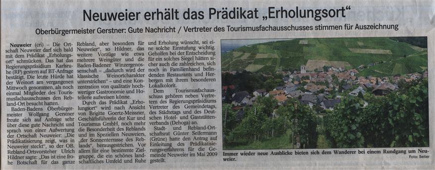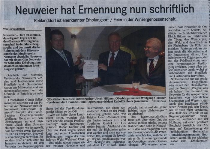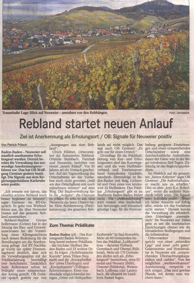 im Auftrag der bündnisgrünen Fraktion des Ortschaftsrates Rebland hatte ich den obigen Antrag gestellt. In dessen Folge ist es Ihnen und Ihren Mitarbeitern als erstem Schritt gelungen, die Prädikatisierung des Stadtteiles Neuweier zu erreichen.