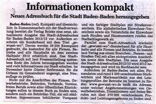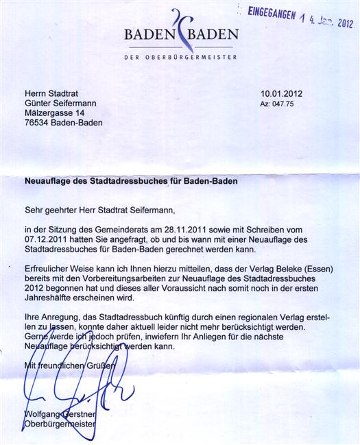 Anfrage wegen Neuauflage eines Stadtadressbuches Baden-Baden
