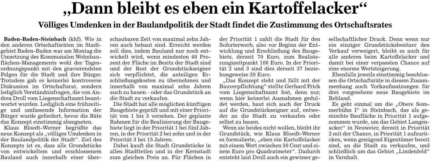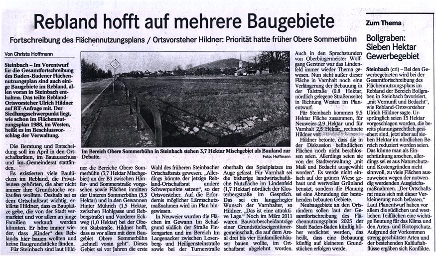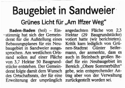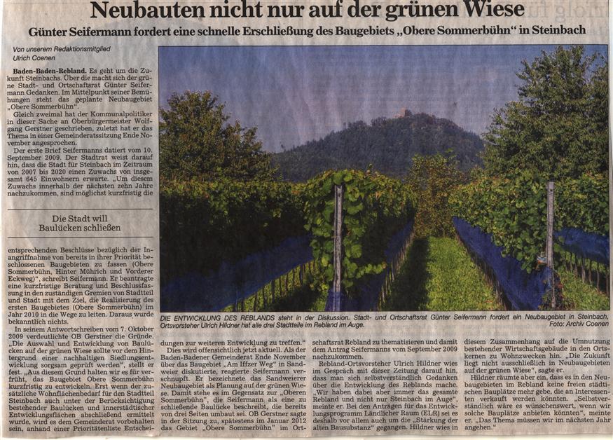 Anlässlich der Beratung über das neue Baugebiet von 3,7 Hektar (50 Bauplätze) in Sandweier beklagte Günter Seifermann sich bei OB Gerstner, dass er bis heute keine Antwort auf seinen Brief vom September 2009 erhalten habe und nun bei “Iffzer Weg” all das unberücksichtigt blieb, was bei “Obere Sommerbühn” laut OB-Schreiben vom 07.10.2009 zuvor abzuklären sei. “Iffzer Weg” sei, so Seifermann, im Gegensatz zu “Obere Sommerbühn” ein Gebiet auf der “grünen Wiese”, “Obere Sommerbühn” aber eine zu schließende Baulücke, die bereits von drei Seiten umbaut sei. OB Gerstner sagte zu, spätestens im Januar 2012 das Gebiet “Obere Sommerbühn” im Ortschaftsrat Rebland zu thematisieren und damit dem Antrag Seifermanns vom September 2009 nachzukommen.