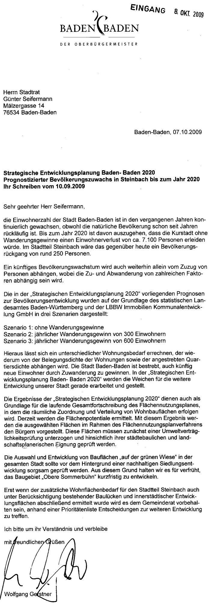 Brief vom 08.Oktober 2009 an Herrn Oberbürgermeister Wolfgang Gerstner