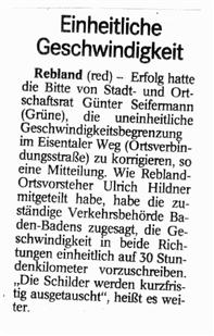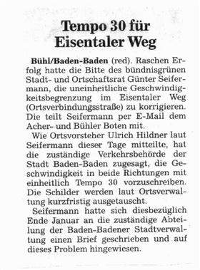 Raschen Erfolg hatte die Bitte des bündnisgrünen Stadt- und Ortschaftsrat Günter Seifermann, die uneinheitliche Geschwindigkeitsbegrenzung im Eisentaler Weg (Ortsverbindungsstraße) zu korrigieren. Wie Ortsvorsteher Hildner gestern mitteilte, hat die zuständige Verkehrsbehörde der Stadt Baden-Baden zugesagt, die Geschwindigkeit in beide Richtungen mit einheitlich 30 km/h vorzuschreiben. Die Schilder werden kurzfristig ausgetauscht. Diese erfreuliche Mitteilung konnte Seifermann heute am 17. April 2012 den ihn angesprochenen MitbürgerInnen machen.