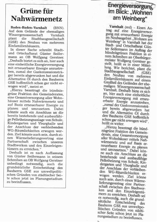 Hierzu beantragt die bündnisgrüne Fraktion des Gemeinderates, eine Gesamtversorgung aller Wohnhäuser mittels Nahwärmenetz und auf Basis erneuerbarer Energie zu planen und umzusetzen. Dabei könnte auch ein Anschluss an die bereits bestehende und ausbaufähige Pelletheizungsanlage von Schule, Kindergarten und Yburghalle und der Anschluss der verbleibenden WG-Räumlichkeiten erwogen werden.