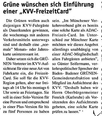 “Im Münchener Verkehrsverbund gibt es bereits eine solche Karte als ADAC– Freizeit-Card. Im Unterschied zur Münchner Karte möchten wir dieses Angebot allerdings unabhängig von einer ADAC-Mitgliedschaft allen Fahrgästen anbieten”, so Günter Seifermann, verkehrspolitischer Sprecher der Baden- Badener GRÜNEN-Gemeinderatsfraktion und Mitglied im Aufsichtsrat des KVV. “Deshalb haben wir Herrn Oberbürgermeister Fenrich (Karlsruhe) als Vorsitzenden des Aufsichtsrats gebeten, eine solche Karte prüfen zu lassen.”