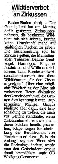 Mit der bisherigen Liste dürften immerhin Zirkusse wie Krone oder Voyage (beide mit Nashorn) nicht mehr auf öffentliche Plätze in Baden Baden.
