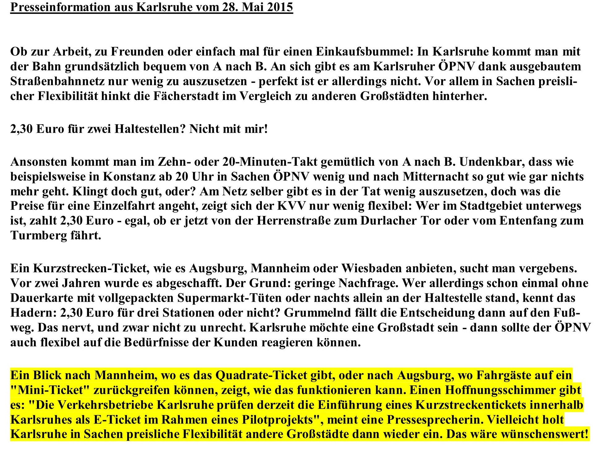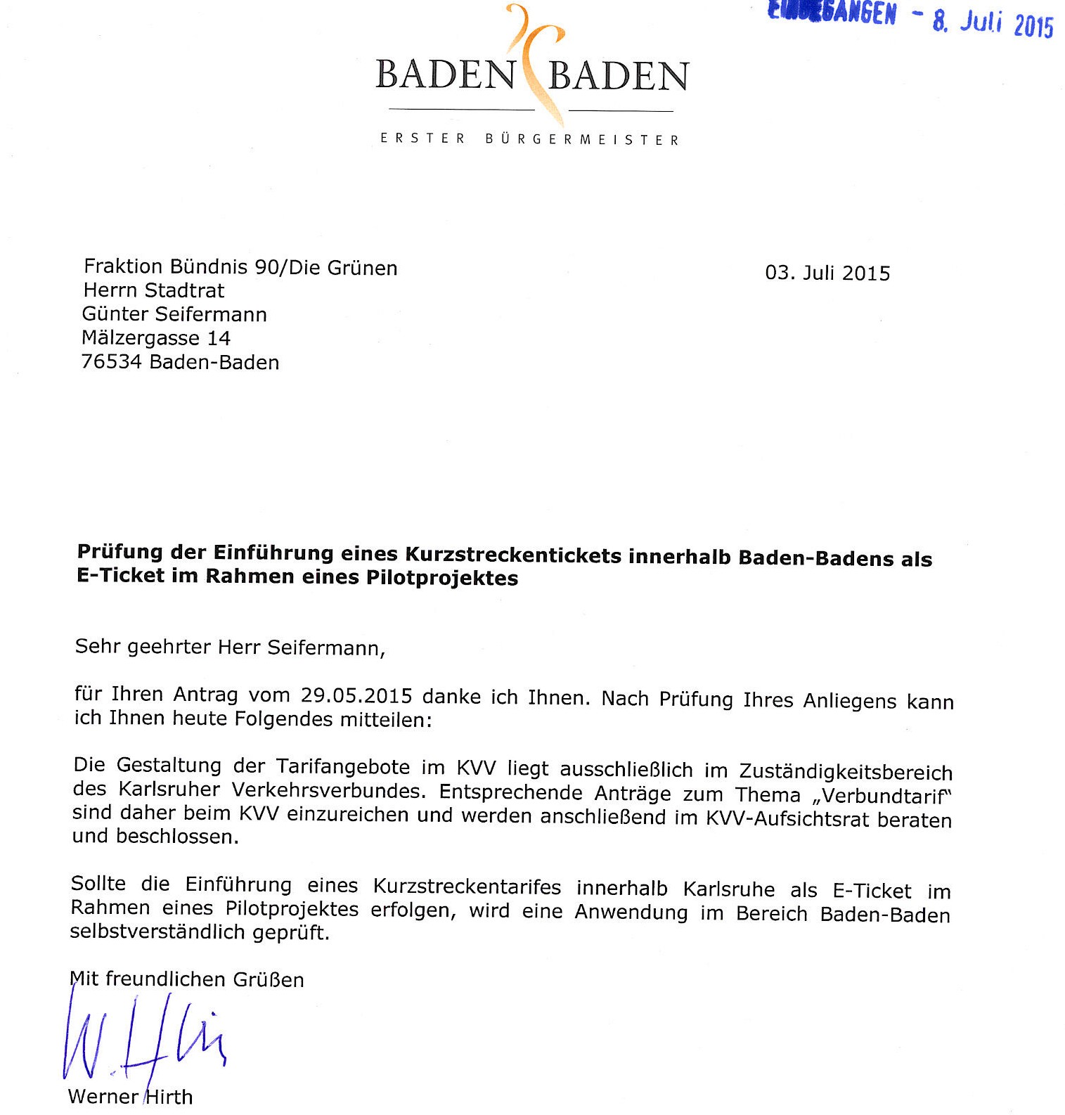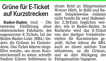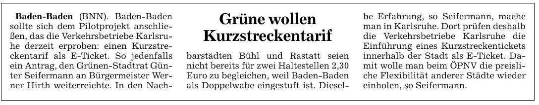 «2,30 Euro für zwei Haltestellen − Mit mir nicht», heißt eine Parole aus Karlsruhe. Dort macht man sich nun Gedanken über ein neues Tarifangebot. In einem von Stadtrat Günter Seifermann unterschriebenen Antrag fordern die Baden-Badener Grünen den zuständigen Bürgermeister Werner Hirth auf, ebenfalls einen Kurztarif auf den Weg zu bringen. Solche Tarife gebe es im Nahbereich bereits in Bühl und Rastatt. PDF Schreiben an Werner Hirth