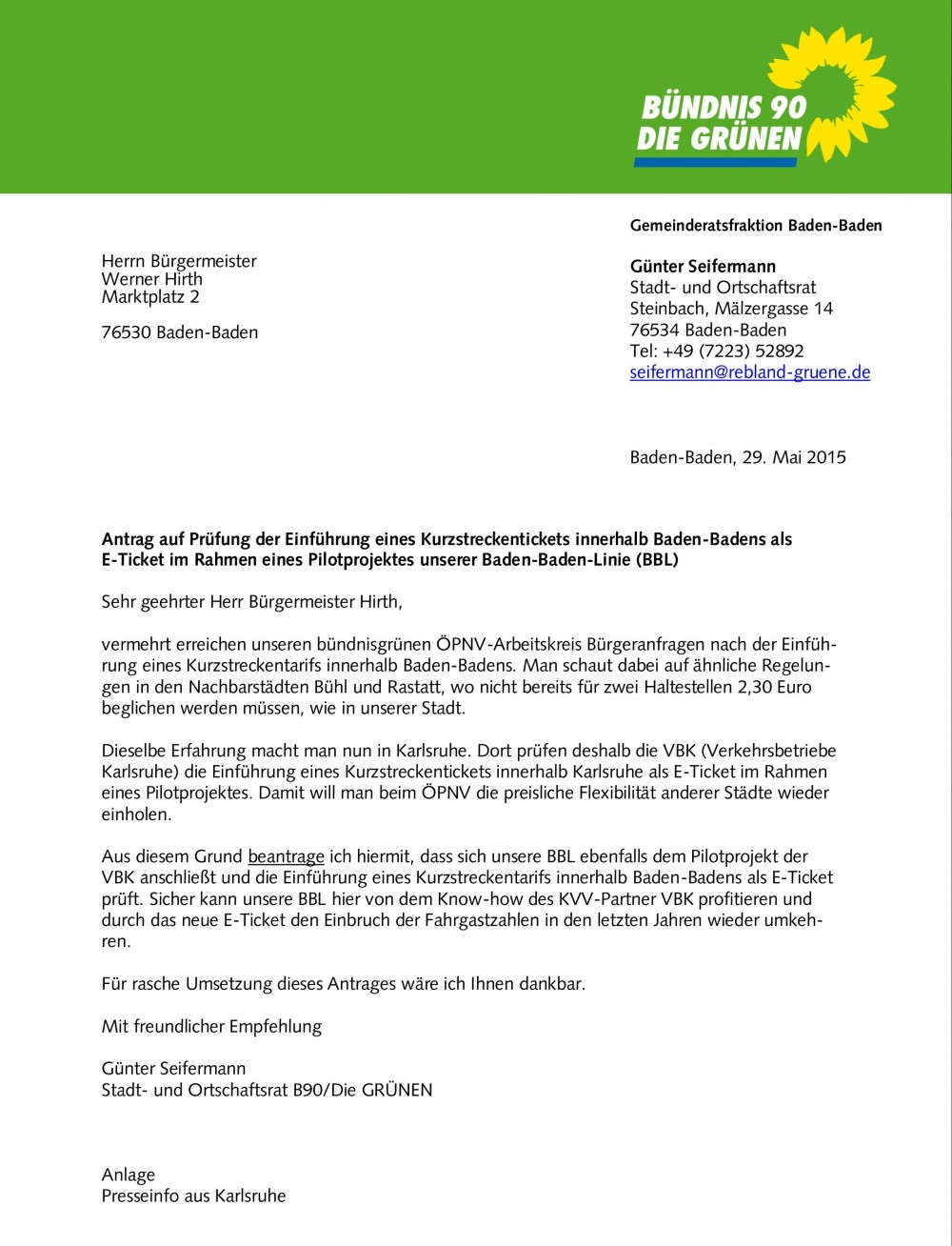Einer der am meisten geäußerten Wünsche zum Baden-Badener Buslinienverkehr ist die Schaffung eines Kurzstreckentickets im Gebiet der Stadt Baden-Baden. Ein solches Ticket ist in vielen anderen Städten längst gängige Praxis und dient nicht zuletzt auch unserer Umwelt. Der Grünen-Stadtrat Günter Seifermann stellte deshalb den folgenden Antrag an den zuständigen Dezernenten: