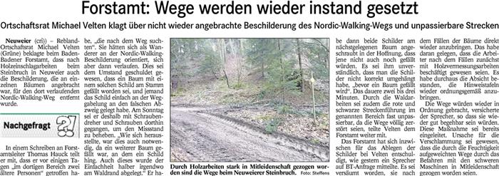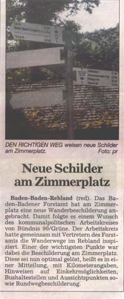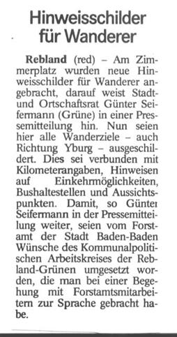 Das Wanderwegenetz im Bereich zwischen Rebland und Bühlertal ist zwar größtenteils vorhanden, nur kommen immer wieder Klagen aus der Bürgerschaft und vor allem von Gästen, dass die nötigen Beschilderungen entweder ganz fehlen oder aber in desolatem Zustand sind. Die stark interessierende Verbindung zwischen Bühlertal und dem Raum Yburg ist beispielsweise ein Thema für die Bündnisgrünen.