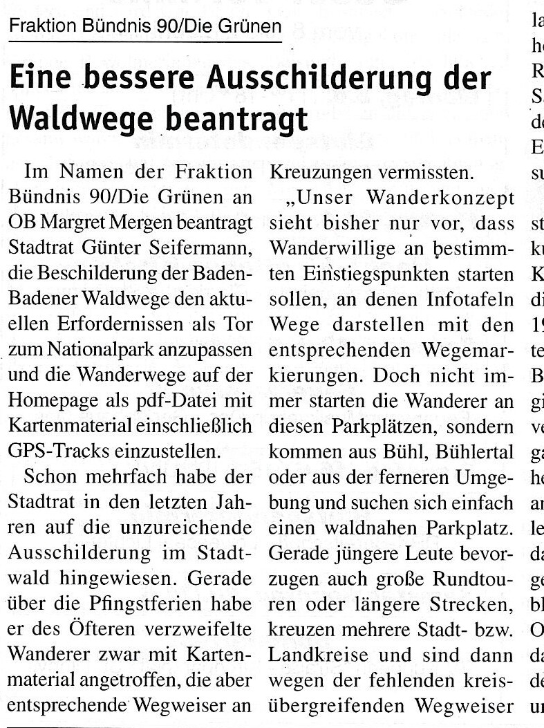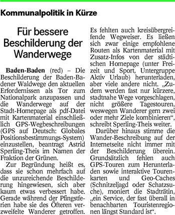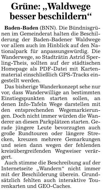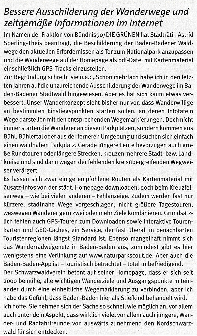 Das Wandern ist der Grünen Lust – Baden-Badener Grüne fordern zeitgemäße Beschilderung – Wanderwege als PDF-Datei mit Kartenmaterial einschließlich GPS-Tracks