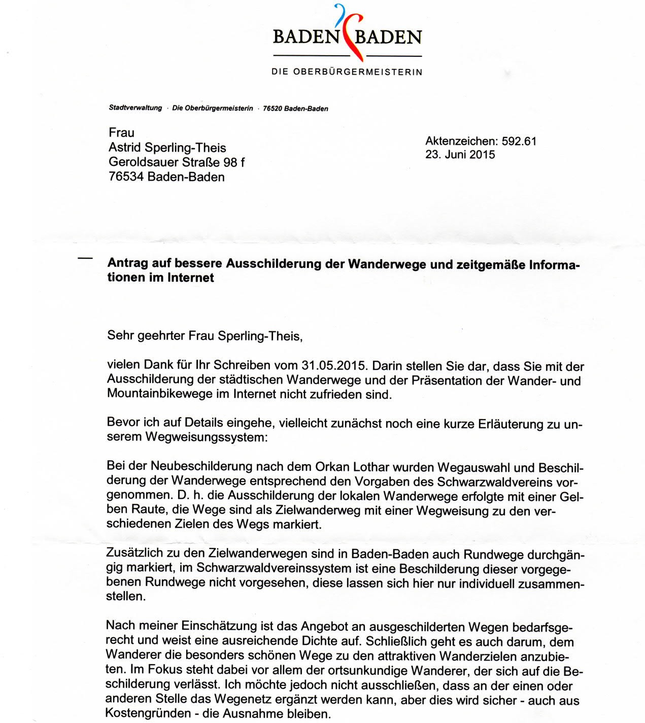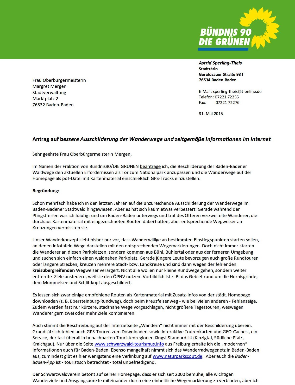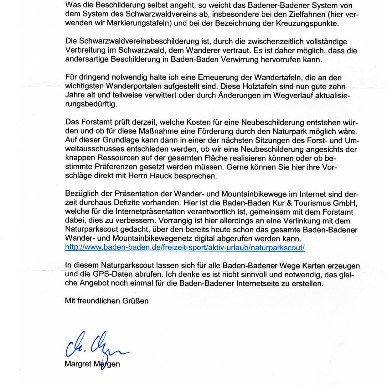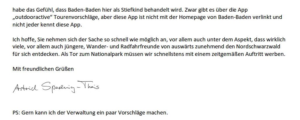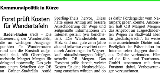 In einem von Astrid Sperling-Theis unterzeichneten Schreiben fordern sie Oberbürgermeisterin Margret Mergen auf, dafür zu sorgen die Beschilderung «den aktuellen Erfordernissen als Tor zum Nationalpark anzupassen». Die Wanderwege sollen auf der Homepage als PDF-Datei mit Kartenmaterial einschließlich GPS-Tracks veröffentlicht werden. PDF Schreiben an OB Margret Mergen