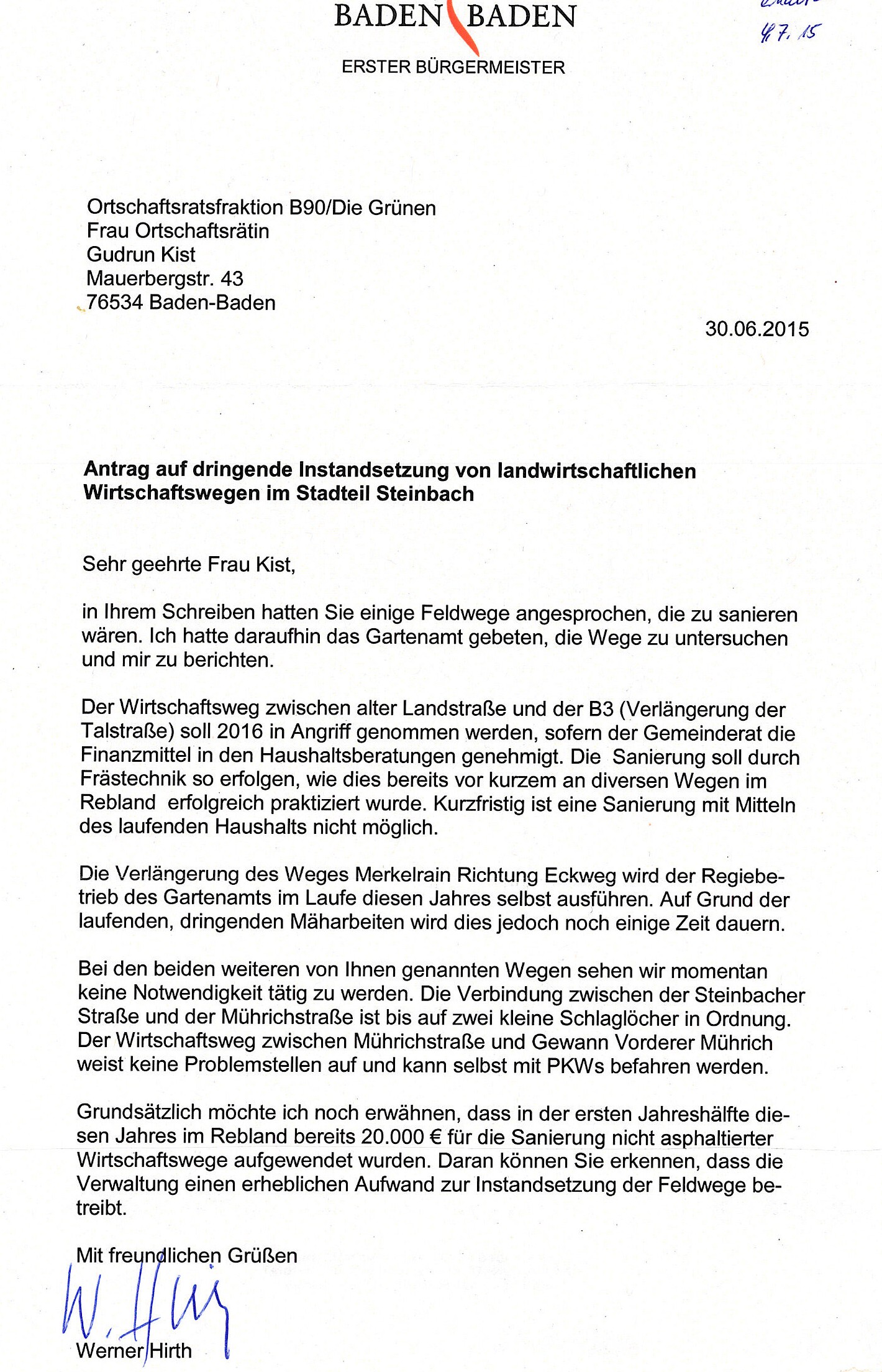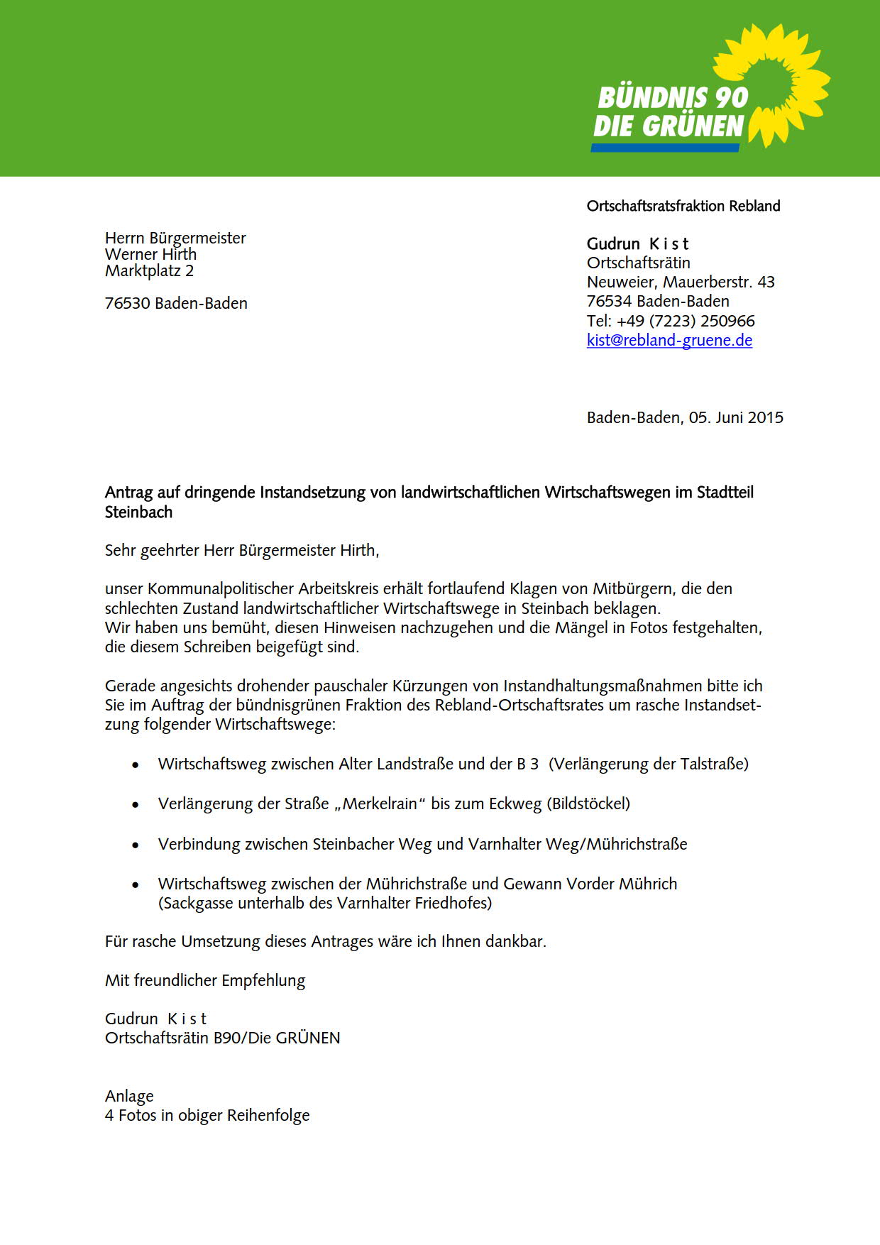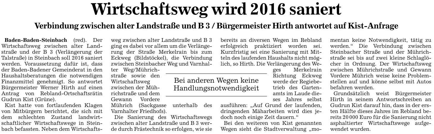 Immer häufiger erreichen den Kommunalpolitischen Arbeitskreis der Rebland-Grünen Hinweise aus der Bürgerschaft auf desolate Wirtschaftswege, die sowohl der hiesigen Landwirtschaft, aber vor allem auch Fußgängern und Radfahrern das Nutzen der Wege erschweren. Deshalb hat sich Ortschaftsrätin Gudrun Kist mit folgendem Antrag an Bürgermeister Hirth gewandt: