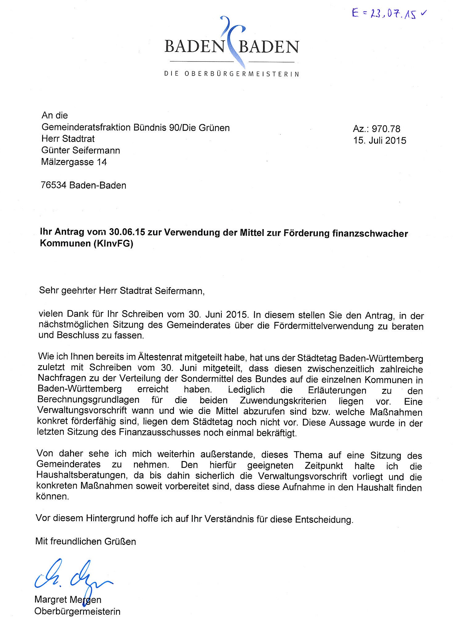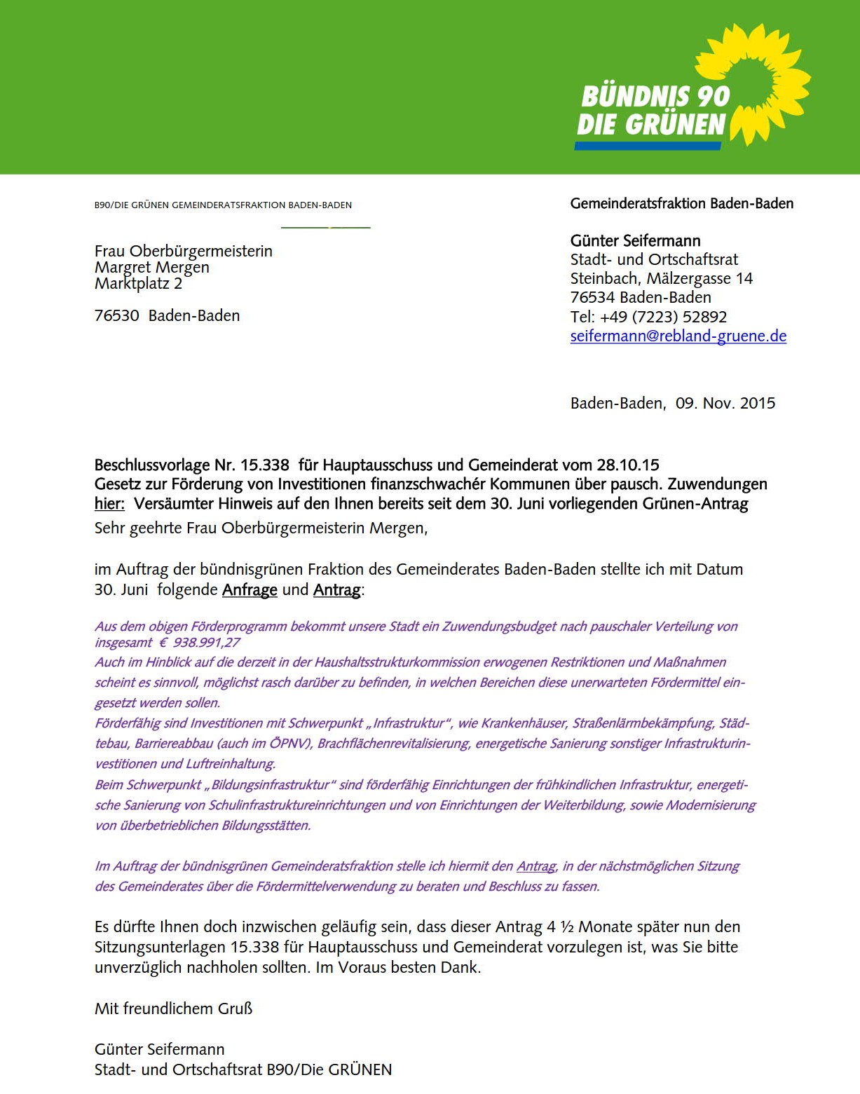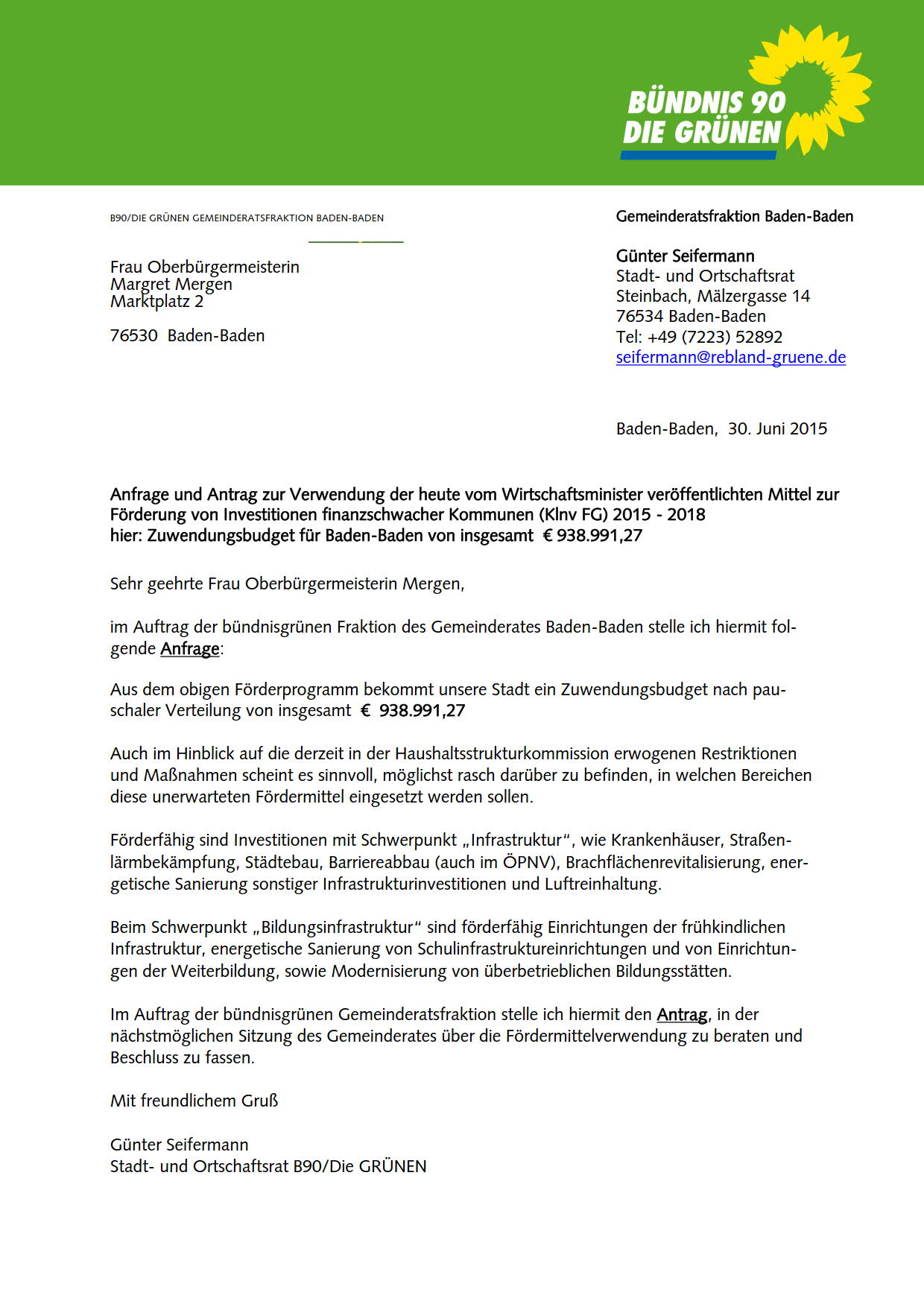 In einem Schreiben machte er Oberbürgermeisterin Margret Mergen auf das Fehlen «eines Ihnen längst vorliegenden bündnisgrünen Antrages» aufmerksam. Schreiben an OB Margret Mergen und Antrag