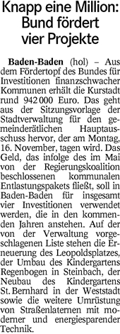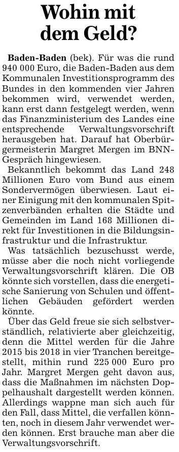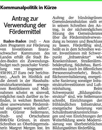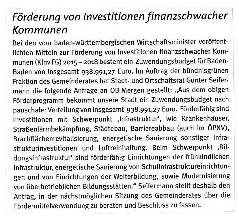 Nach einer Information der bündnisgrünen Landtagsabgeordneten Beate Böhlen erhalten 970 Baden-Württembergische Kommunen insgesamt 248 Millionen Euro aus einem Sondervermögen des Bundes für zusätzliche Investitionen in die Bildungsinfrastruktur und Infrastruktur. Auch Baden-Baden kommt dabei im Zeitraum von 2015 bis 2018 in den Genuss, weshalb die Grünen-Fraktion des Gemeinderates folgende Anfrage/Antrag an OB Mergen stellte:
