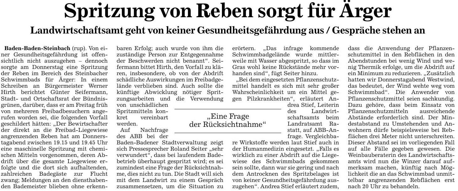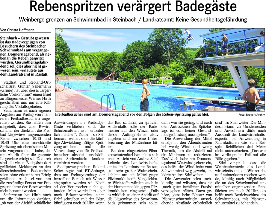 heute früh haben mich mehrere Freibadbesucher angerufen und folgenden Vorfall geschildert: Der Bewirtschafter der direkt an die Freibad-Liegewiese angrenzenden Reben hat gestern Abend (16.07.) zwischen 19:15 und 19:45 Uhr eine maschinelle Spritzung mit chemischen Mitteln vorgenommen, deren Abdrift über die gesamte Liegewiese und die dort sich aufhaltenden, zahlreichen Badegäste zur Flucht zwang. Meldungen an den diensthabenden Bademeister blieben ohne erkennbaren Erfolg; auch wurde von ihm die zuständige Person zur Entgegennahme der Beschwerden nicht benannt.