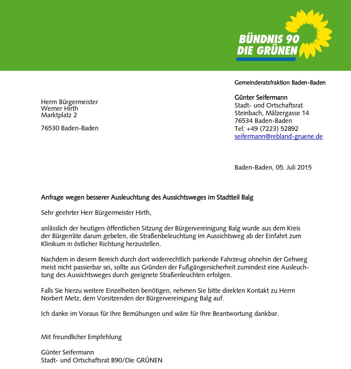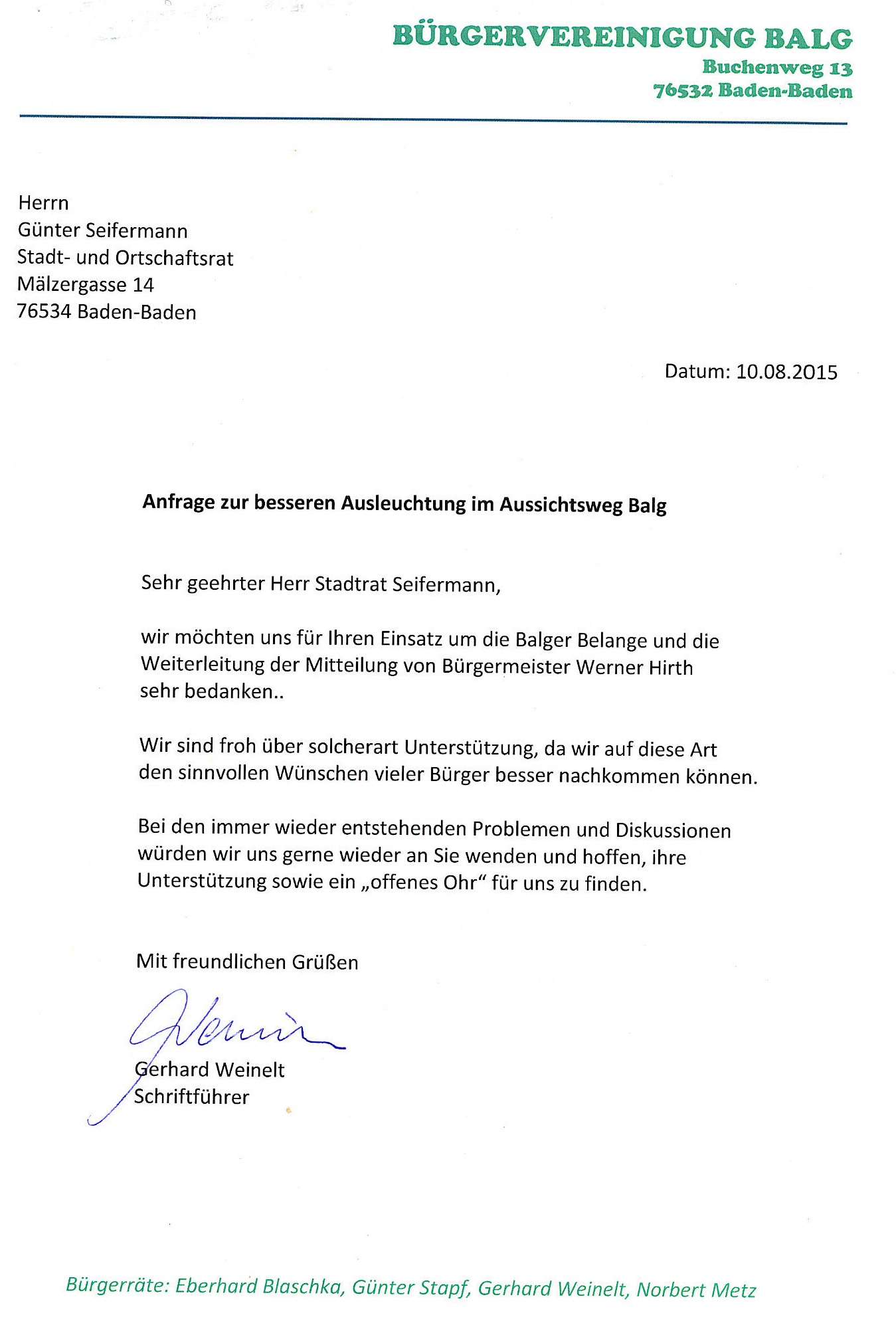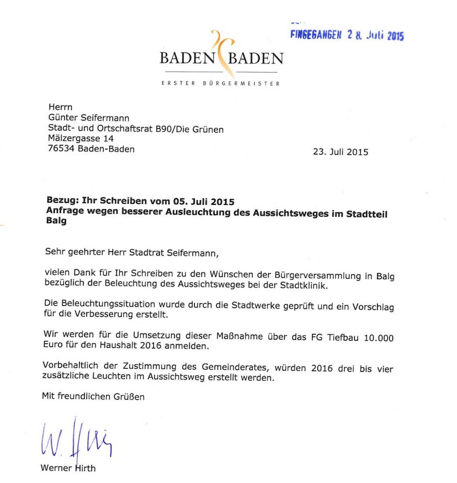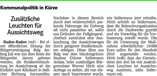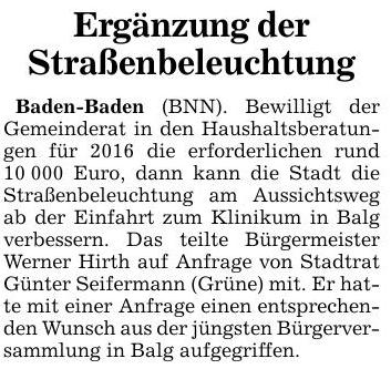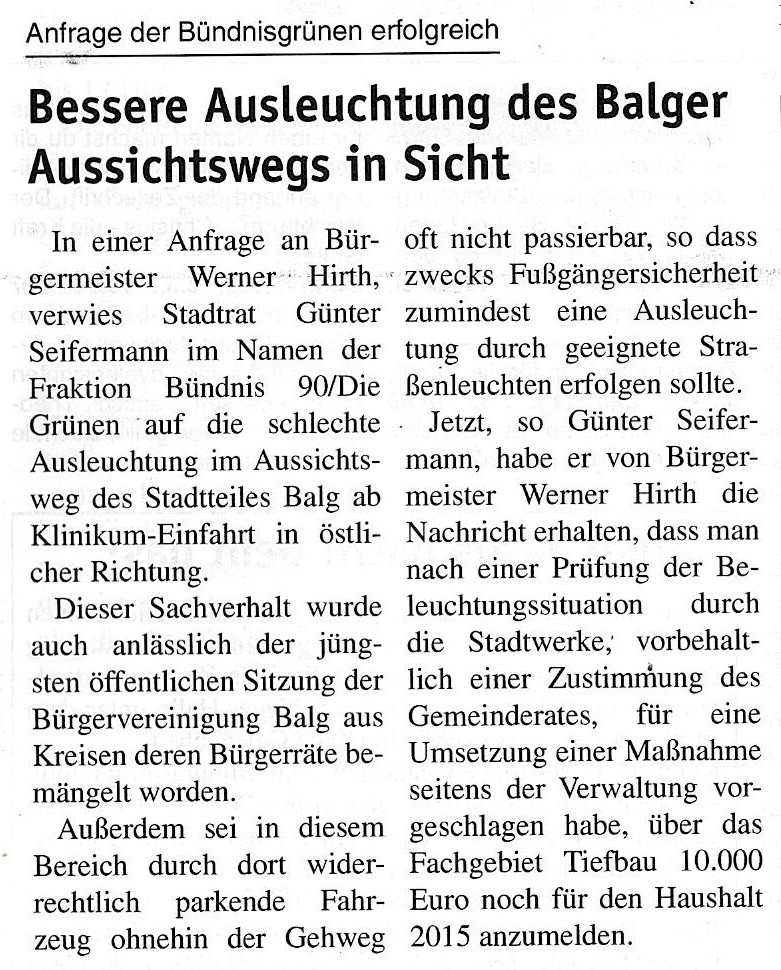 Als Teilnehmer an der Balger Bürgerversammlung vom 05. Juli 2015 griff der bündnisgrüne Stadtrat Günter Seifermann eine Forderung auf bessere Beleuchtung im Aussichtsweg auf und stellte an den zuständigen Dezernenten, Bürgermeister Werner Hirth, die folgende Anfrage: