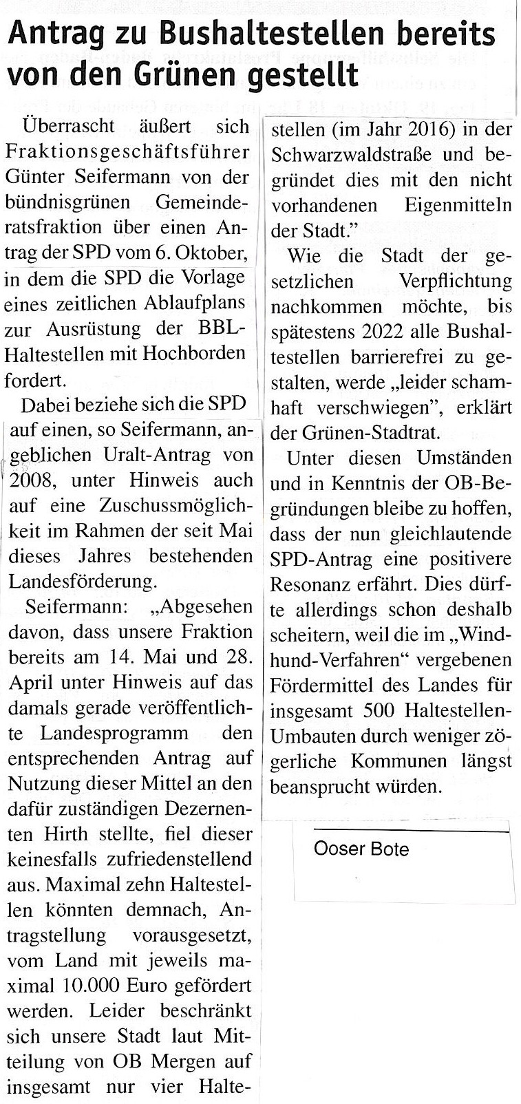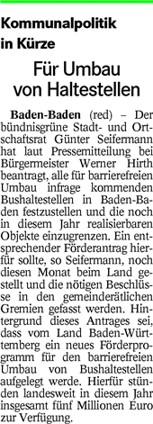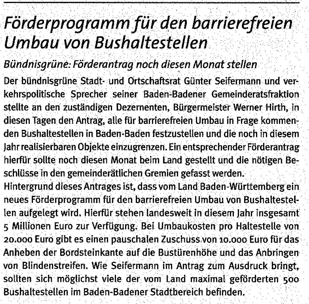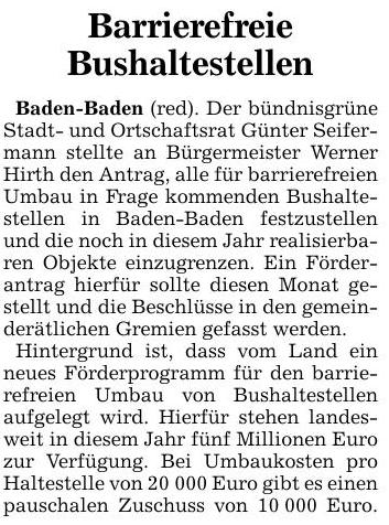 Die B-Badener Bushaltestellen sollen barrierefrei werdenFünf Millionen Euro macht das Land Baden-Württemberg für den barrierefreien Umbau von Bushaltestellen locker. Baden-Baden soll von diesem Förderprogramm profitieren, schreibt der grüne Stadtrat Günter Seifermann an den Ersten Bürgermeister Werner Hirth und stellt den Antrag, «alle für den barrierefreien Umbau in Frage kommenden Bushaltestellen in unserer Stadt festzustellen und die noch in diesem Jahr realisierbaren Objekte einzugrenzen». PDF Antrag