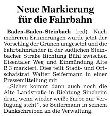 Seit dem Jahr 2012 fordert der bündnisgrüne Stadt- und Ortschaftsrat Günter Seifermann vom städtischen Fachbetrieb Planen und Bauen das Markieren der Fahrbahnränder in der südlichen Steinbacher Straße (Richtung Bühl) und der Alten Landstraße (Richtung Sinzheim):