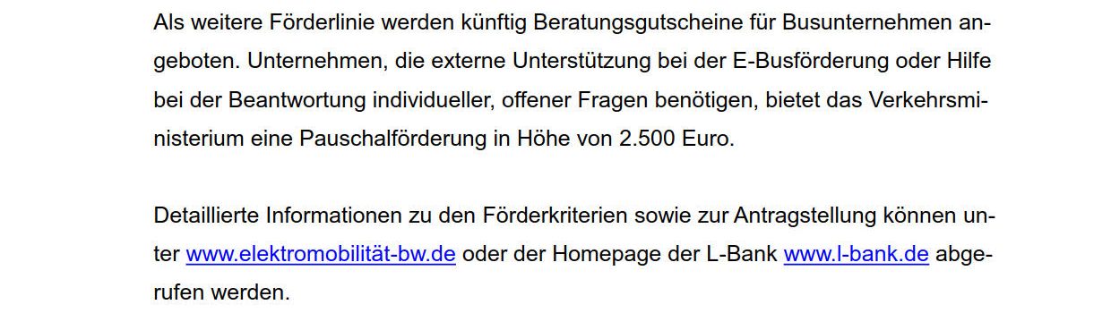 «Selbstverständlich sollte auch die Möglichkeit der Investitionsförderung durch das Verkehrsministerium Baden-Württemberg für Elektrobusse in ÖPNV-Busunternehmen genutzt werden», denkt der grüne Politiker auch an das notwendige Geld.