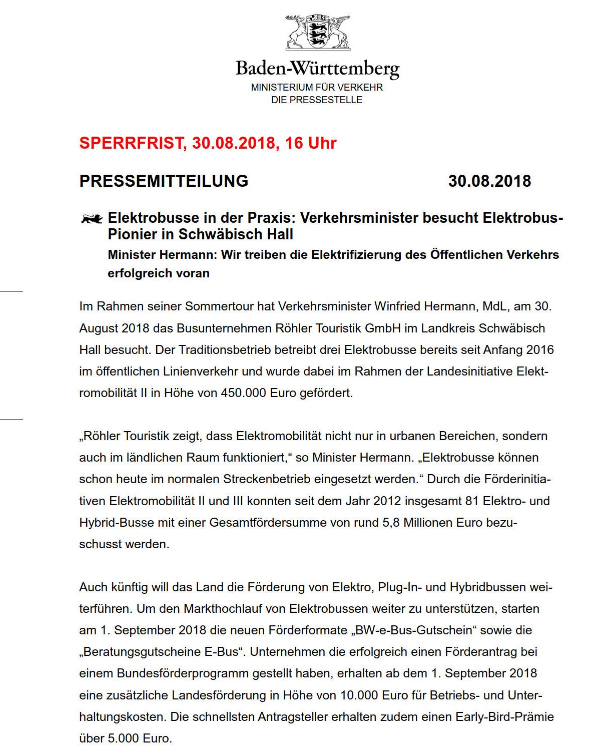 Trotz Zusage des für gemeinderätliche Anträge allein zuständigen Dezernenten, Herrn Bürgermeister Hirth, habe der Abteilungsleiter Güldner von der Baden-Baden-Linie halte dieser eine Beratung und Diskussion im Betriebsausschuss mit fadenscheiniger Begründung «die Zeit für Elektrobusse ist noch nicht gekommen» für unnötig. Die BBL wisse, dass in den Städten Hamburg, Bonn, Köln, Berlin, Aachen, Dresden, Suhl, Braunschweig, Münster, Mülheim, Lübeck und Salzgitter, sowie in vielen weiteren deutschen und europäischen Städten bereits reine Elektrobusse fester Bestandteil des Fuhrparks sei, dennoch werde, unter Hinweis auf «unterschiedliche Techniken» und «noch in Entwicklung» versucht, die von mir für Baden-Baden beantragte Durchführung von Testfahrten auf der Tallinie 201 von Güldner negiert mit der Behauptung, «es gibt noch kein Fahrzeug, das wir testen können».