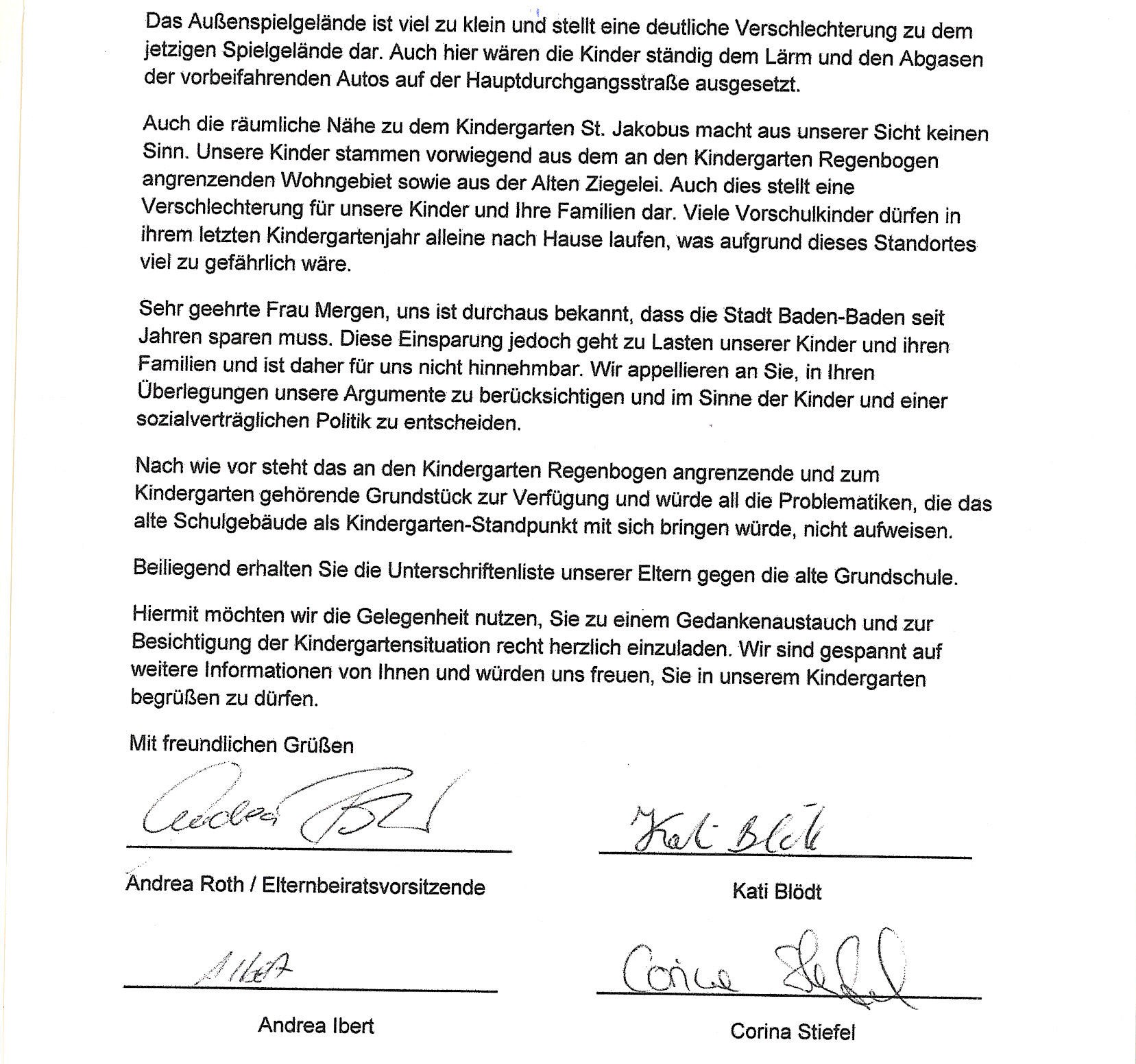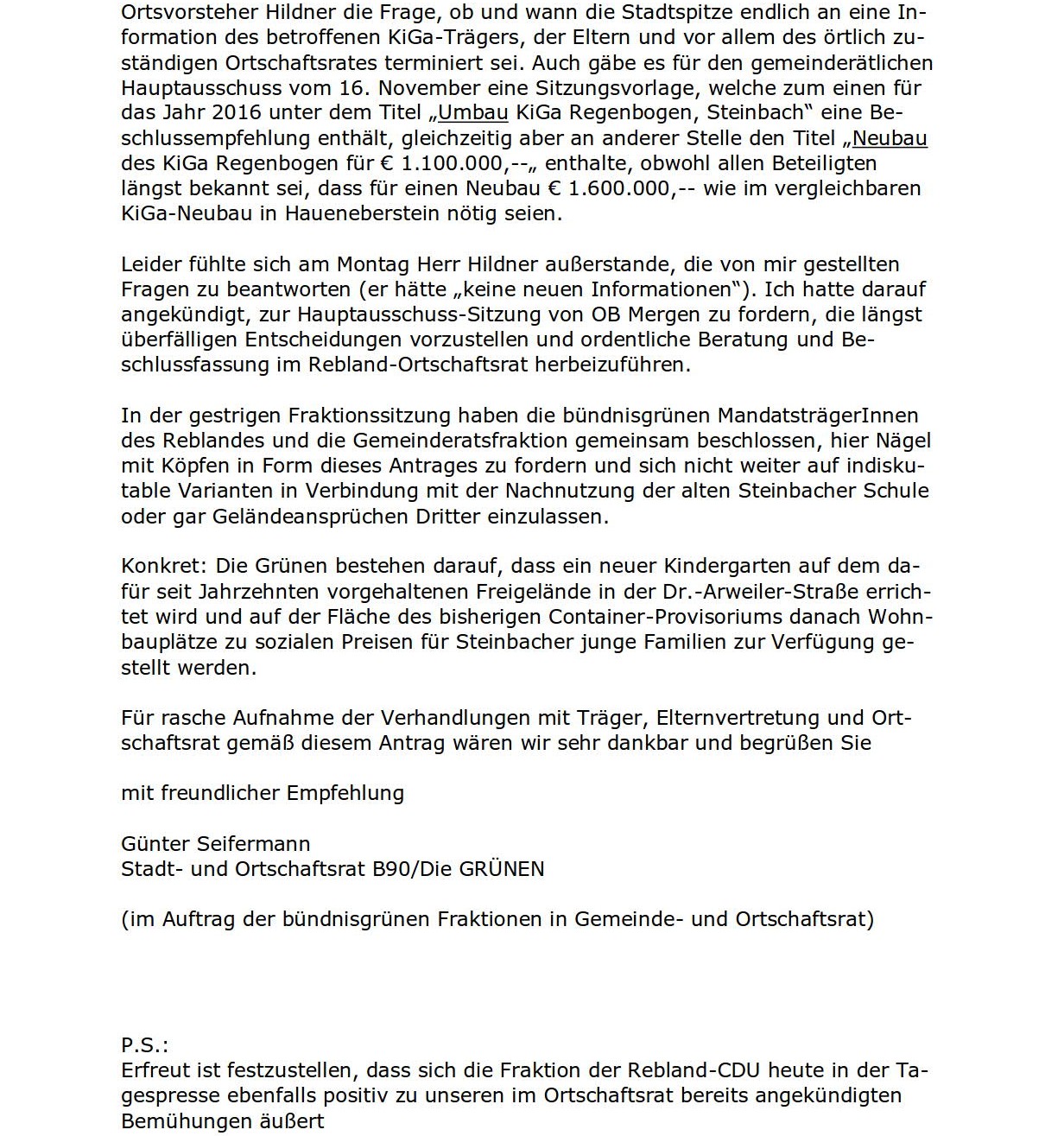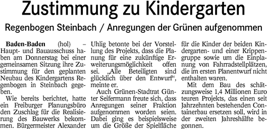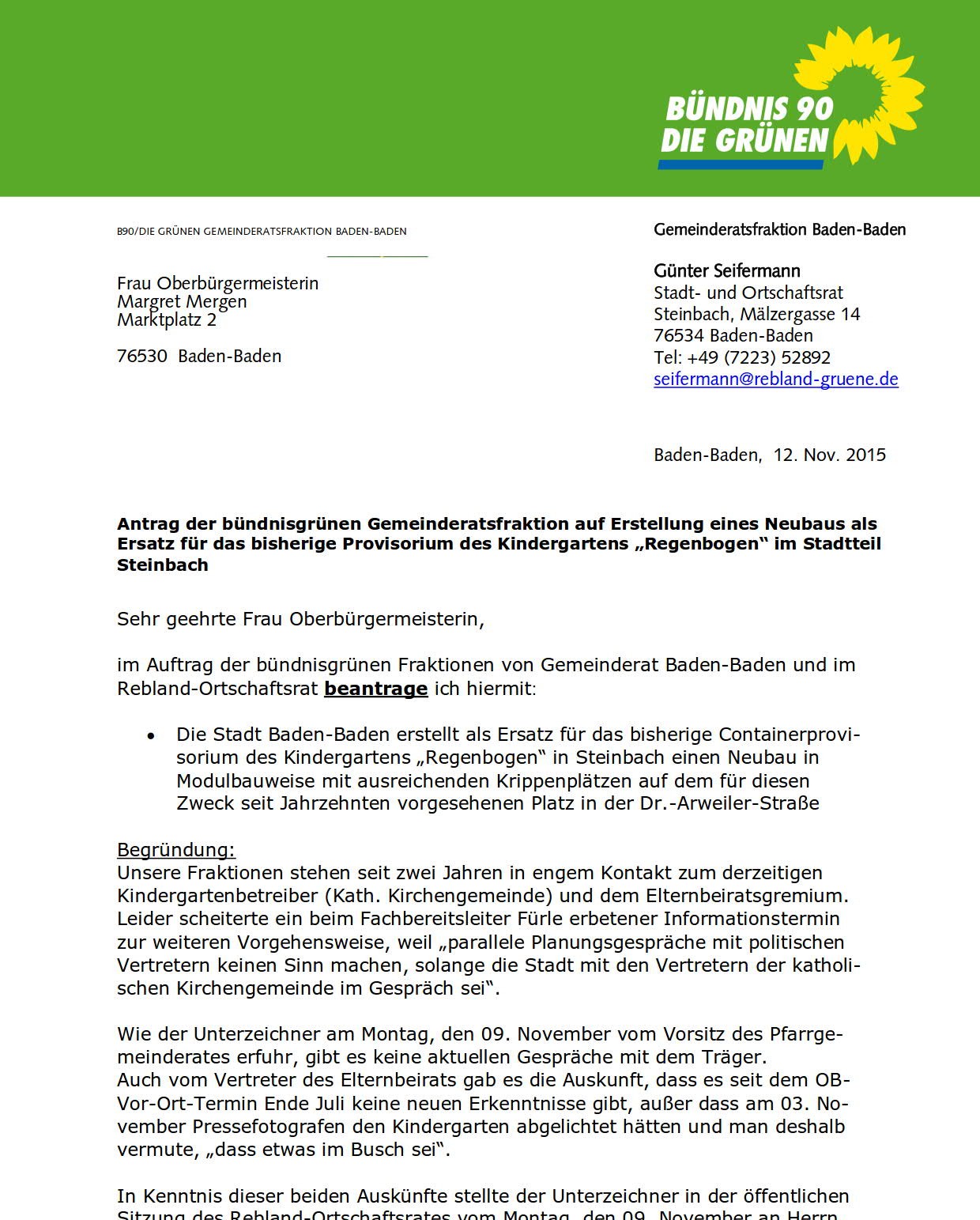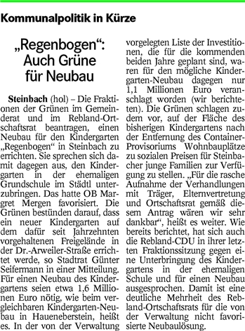 Der Antrag vom November lautete: «Die Stadt Baden-Baden erstellt als Ersatz für das bisherige Containerprovisorium des Kindergartens ‘Regenbogen’ in Steinbach einen Neubau in Modulbauweise mit ausreichenden Krippenplätzen auf dem für diesen Zweck seit Jahrzehnten vorgesehenen Platz in der Dr.-Arweiler-Straße.» Das Schreiben von gestern an OB Margret Mergen und der Antrag vom November 2015 als PDF