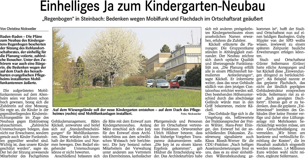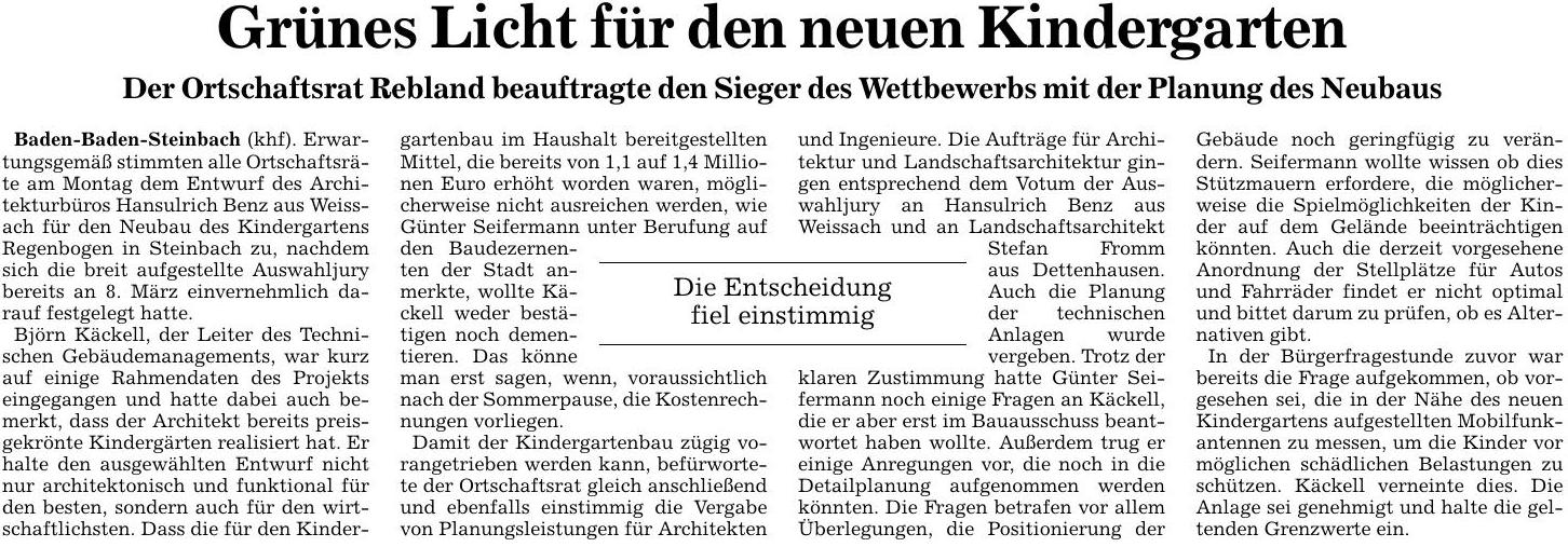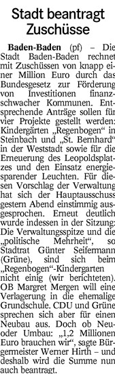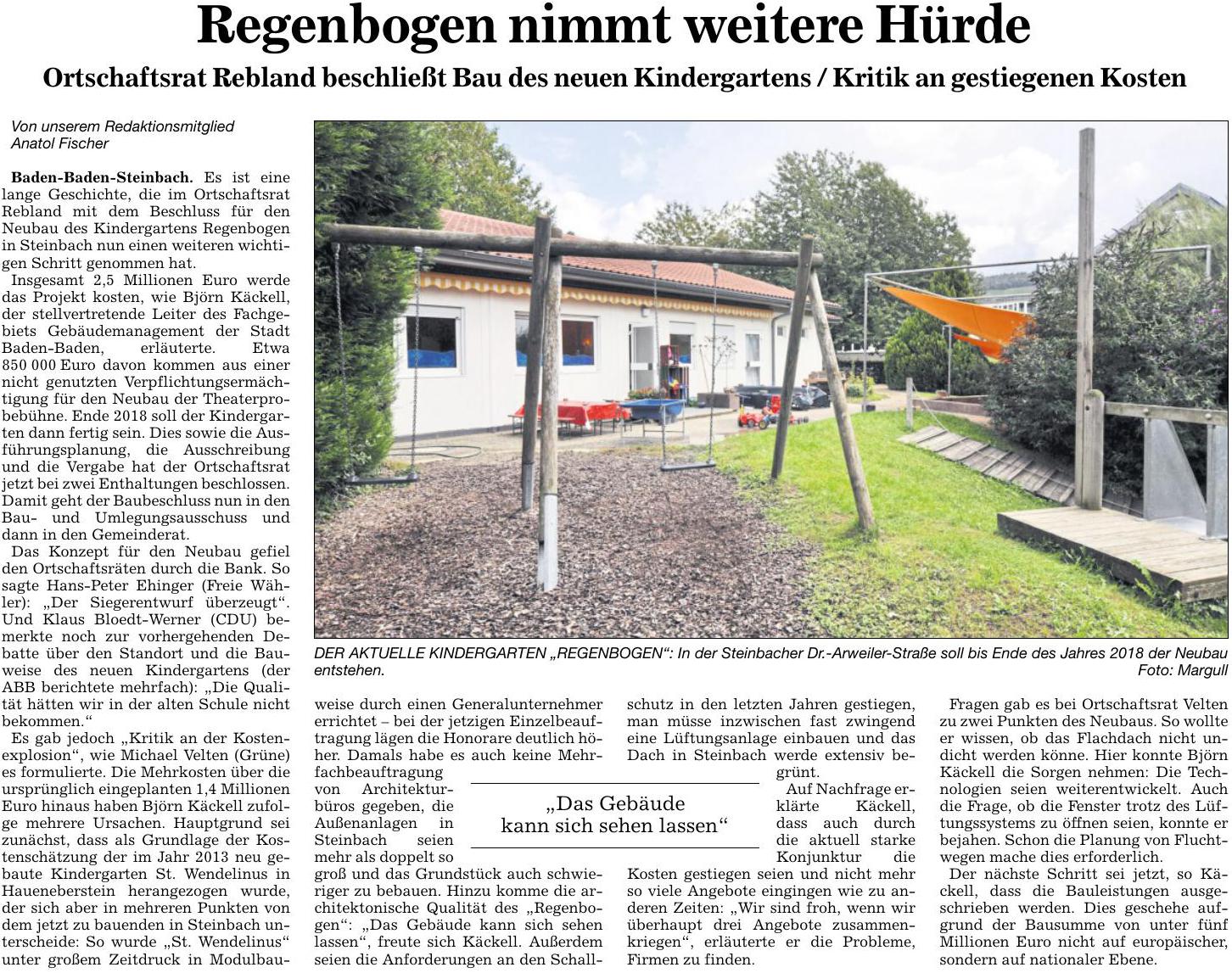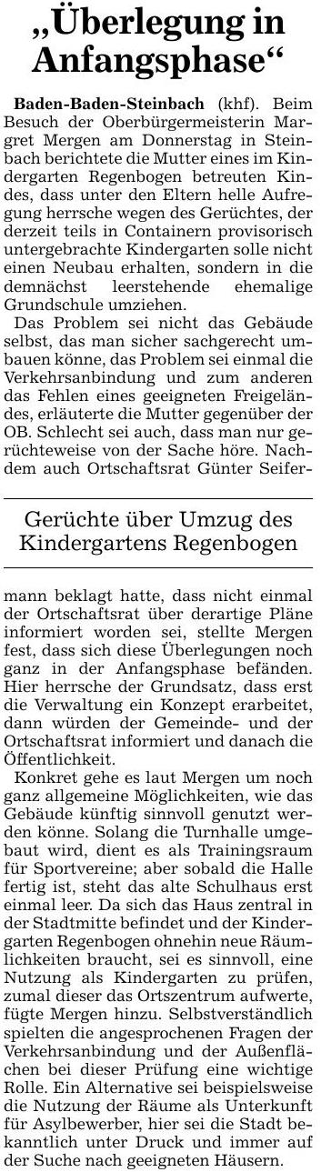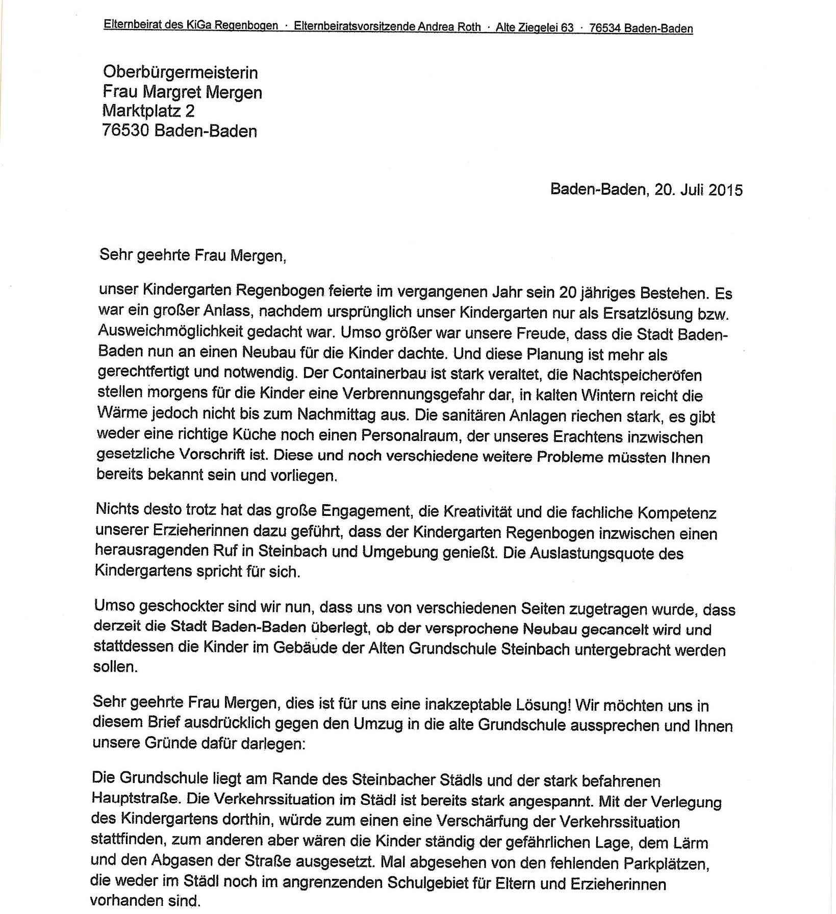 Der Antrag vom November lautete: «Die Stadt Baden-Baden erstellt als Ersatz für das bisherige Containerprovisorium des Kindergartens ‘Regenbogen’ in Steinbach einen Neubau in Modulbauweise mit ausreichenden Krippenplätzen auf dem für diesen Zweck seit Jahrzehnten vorgesehenen Platz in der Dr.-Arweiler-Straße.» Das Schreiben von gestern an OB Margret Mergen und der Antrag vom November 2015 als PDF