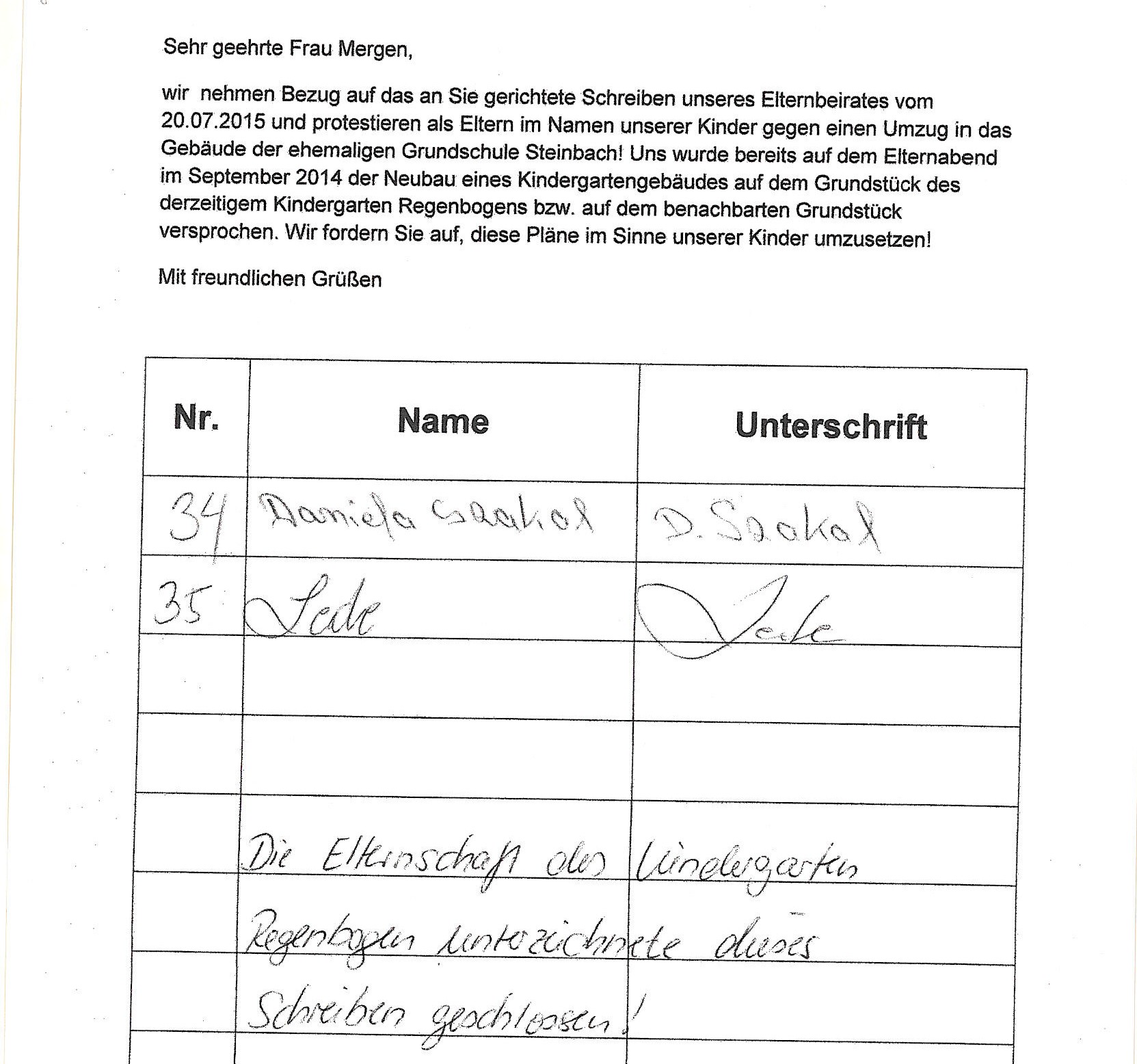 In einem Schreiben an Stadt- und Ortschaftsrat Günter Seifermann sendet der Elternbeirat des Kindergartens Regenbogen Kopien des Schreibens an Frau Oberbürgermeisterin Mergen, dem eine Unterschriftenliste von insgesamt 35 Eltern (die gesamte Elternschaft des Kindergartens) beigefügt war und bittet um Unterstützung des Anliegens. Die Eltern beziehen sich auf den Elternabend im September 2014, in dem der Neubau eines Kindergartengebäudes auf dem Grundstück des derzeitigen Kindergartens bzw. dessen dafür vorgesehener Freifläche versprochen wurde: