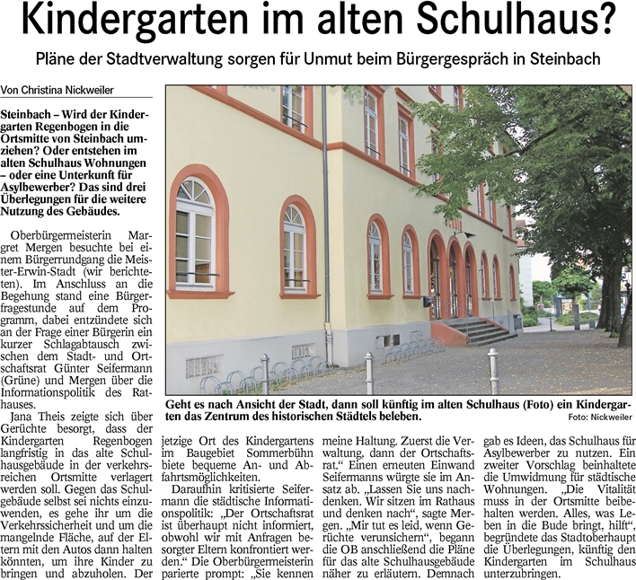 Hintergrund ist, dass uns in der Dezember-Sitzung des Ortschaftsrates angekündigt wurde, im Februar über die Unterbringung des Steinbacher Kindergartens „Regenbogen“ im alten Schulgebäude (Ecke Steinbacher- und Grabenstraße) zu informieren und Beschluss zu fassen.