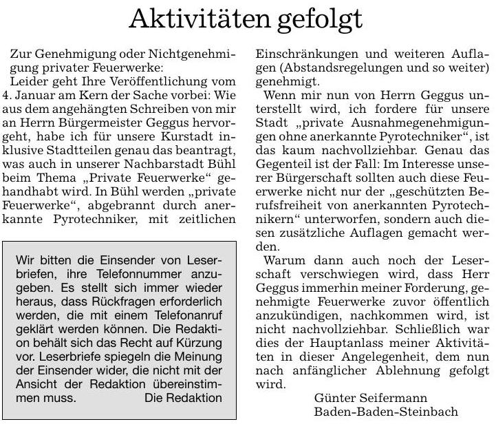 «Wie Sie sehen, gibt es durchaus einen ‘Rechtsraum’, welcher es Ihnen ermöglichen sollte, die Bevölkerung vor unangekündigten nächtlichen Belästigungen zu schützen», gibt Günter Seifermann den mauernden Verantwortlichen in der Stadtverwaltung als Aufgabe. «Auch die Ankündigung der zu erwartenden Lärmbelästigungen durch Feuerwerke über die Presse dürfte doch problemlos machbar sein», appelliert der grüne Stadtrat im Schreiben an Bürgermeister Geggus an das Rathaus. Dort ist das Vertrauen in den vernünftigen Baden-Badener Bürger und die unabhängigen Medien gering. Auch dies macht Stadtrat Günter Seifermann öffentlich. Frau Henke habe damals auch die von ihm vorgeschlagene Information über genehmigte Feuerwerke in der Presse abgelehnt. Zur Begründung habe es aus der Stadtverwaltung geheißen: «Nicht zielführend, da dadurch eine vermehrte öffentliche Aufmerksamkeit werden könnte.» Das Rathaus kam wohl nicht auf den Gedanken, dass erst durch diese gestrige Informationspolitik der Zorn von durch Feuerwerke aufgeschreckten Bürgern erst ausgelöst wurde.