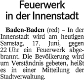 Ich habe nun veranlasst, dass die Baden-Badener Öffentlichkeit über uns angezeigte Feuerwerke, die von Pyrotechnikern im Auftrag abgebrannt werden, in den örtlichen Medien informiert wird.