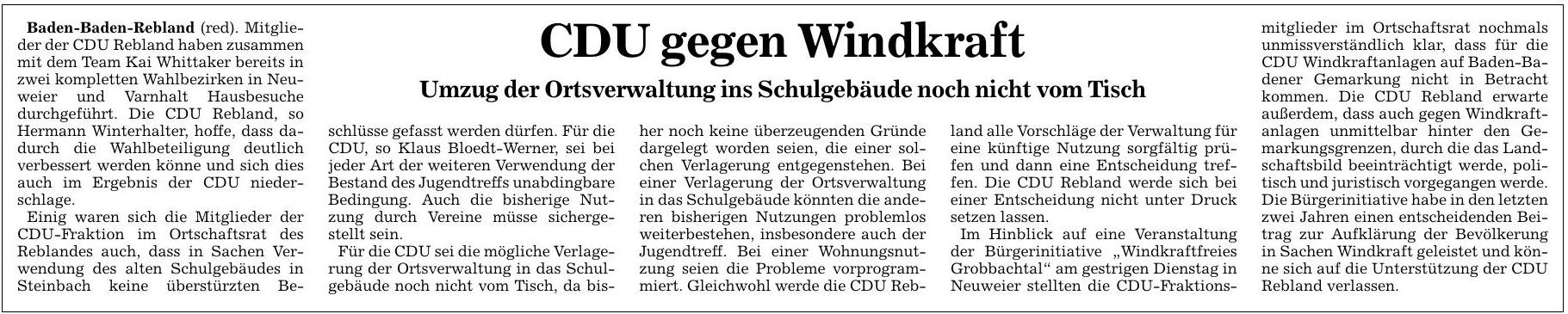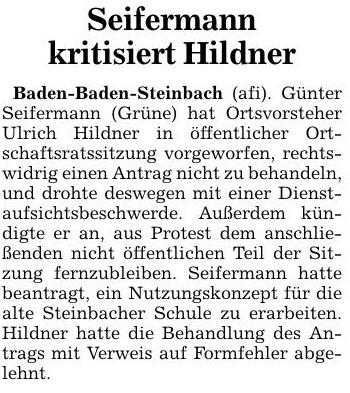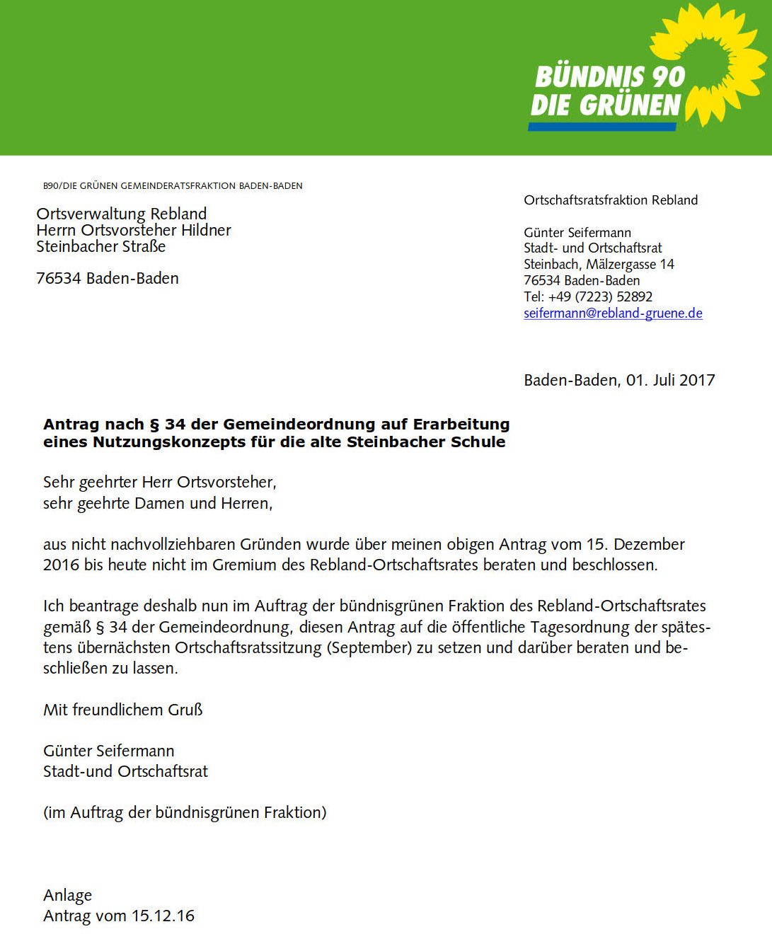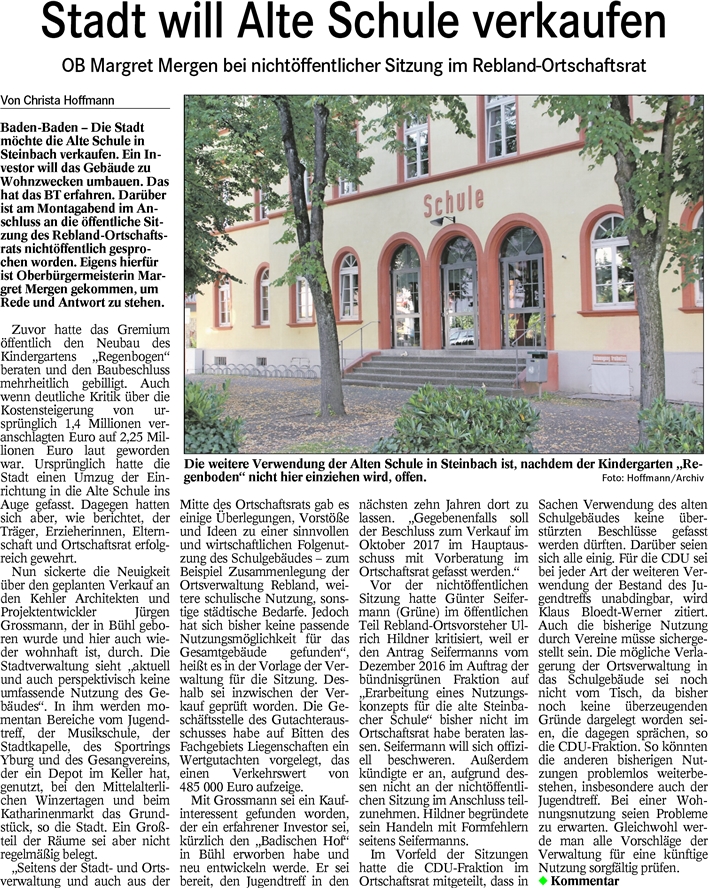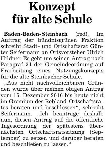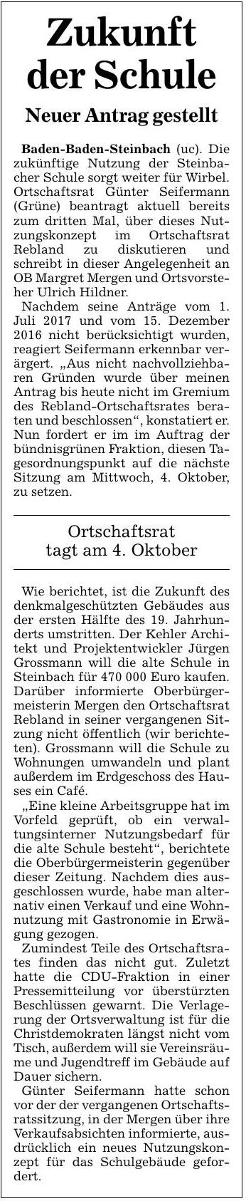 Dadurch wird es nun möglich, in der alten Steinbacher Schule Räumlichkeiten für die Ortsverwaltung Rebland, die Musikschule Baden-Baden und örtliche Vereine bereitzustellen, ohne dadurch den im Keller seit Jahrzehnten erfolgreichen Jugendtreff Rebland zu beeinträchtigen, was den bündnisgrünen Stadt- und Ortschaftsrat Günter Seifermann zu folgendem Antrag veranlasste: