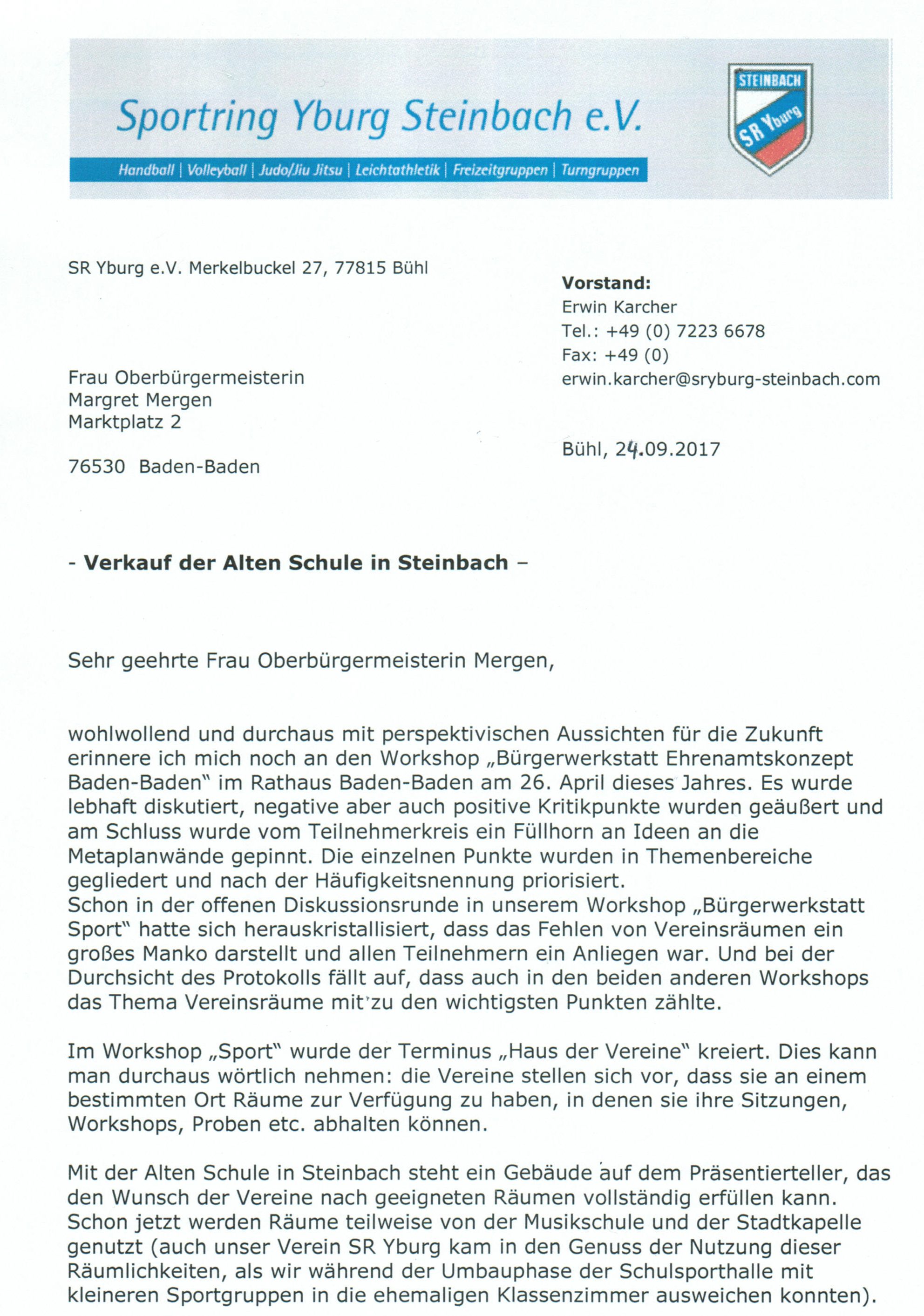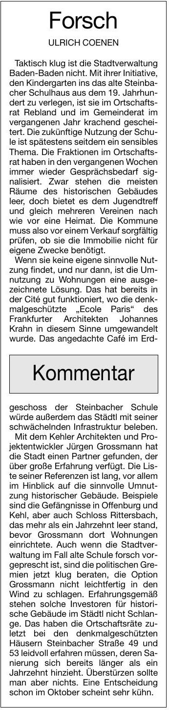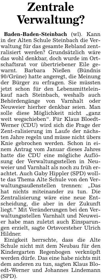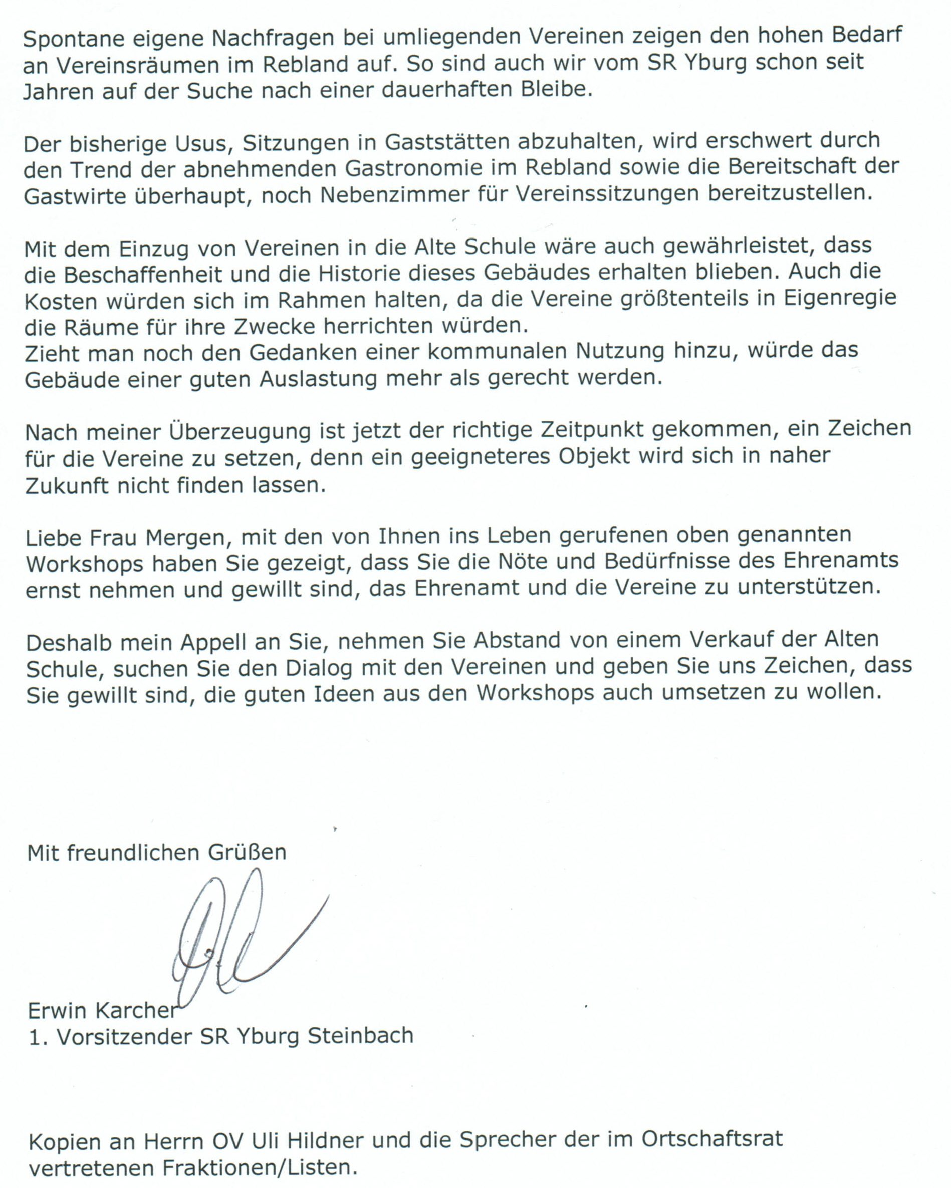 Diese Entscheidung schafft nun die Möglichkeit, in der verkehrsgünstig in der Ortsmitte gelegenen alten Schule Räumlichkeiten für die Ortsverwaltung Rebland, die Musikschule Baden-Baden und örtliche Vereine bereitzustellen, ohne dadurch den im Keller seit Jahr-zehnten erfolgreichen Jugendtreff Rebland zu beeinträchtigen. Gleichzeitig wird dadurch zu einer Belebung des Steinbacher Städtls beigetragen. Ich beantrage aus diesem Grund, nach kurzfristigen Vorberatungen mit den hiesigen örtlichen Vereinen, der städtischen Musikschule und dem Rebland-Ortschaftsrat die räumlichen Erfordernisse abzuklären und daraus ein Nutzungskonzept zu beschließen, damit die daraus resultierenden finanziellen Erfordernisse für den städtischen Haushalt angemeldet werden können.