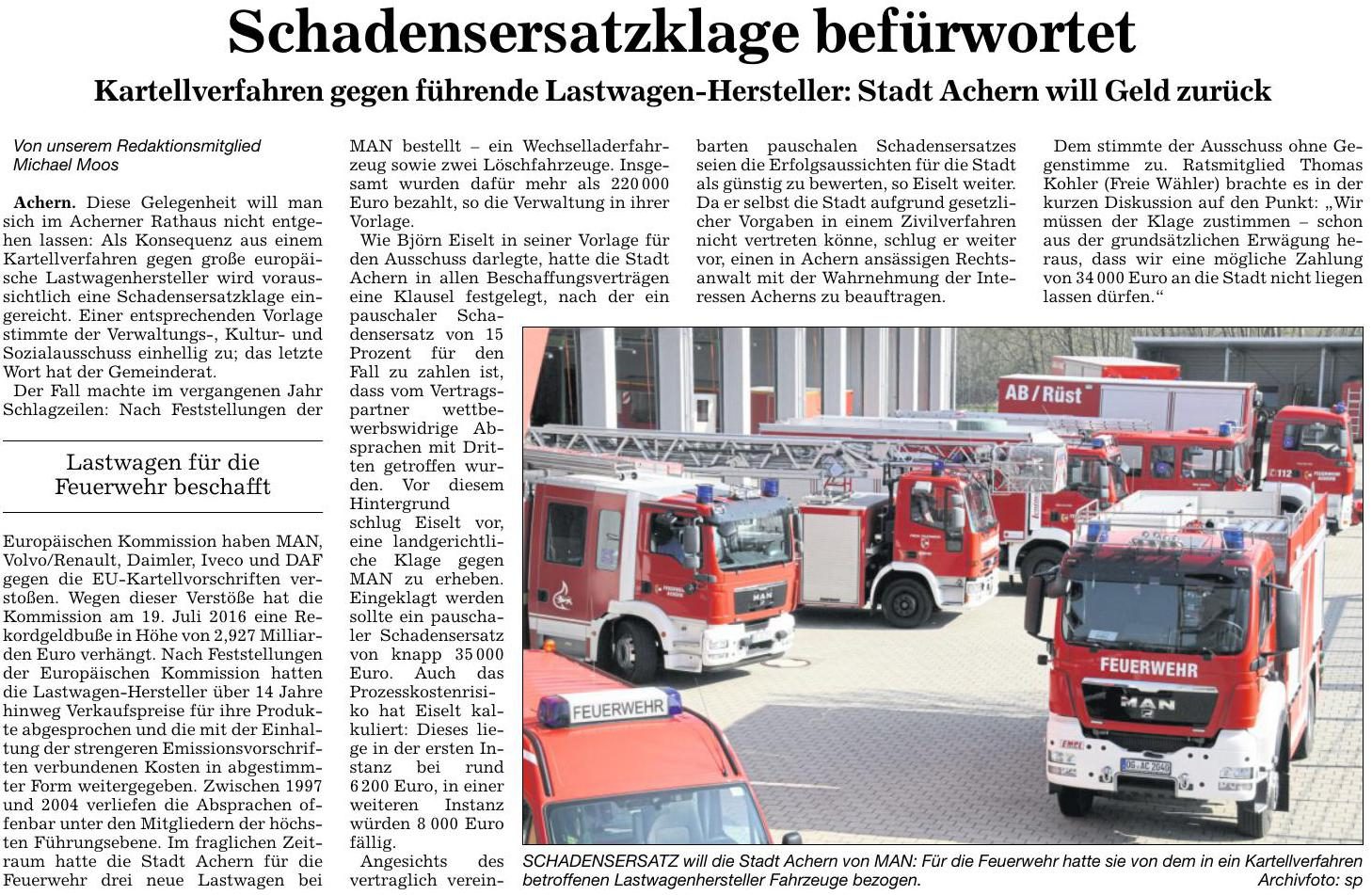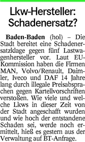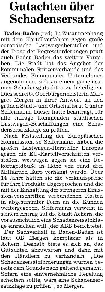 In einem Antrag an die Baden-Badener Oberbürgermeisterin fordert Stadtrat Günter Seifermann die Stadtverwaltung auf, zu prüfen, «ob im Bereich der Stadtverwaltung und deren Gesellschaften und Eigenbetrieben im Hinblick auf das Kartellverfahren gegen führende Lastkraftwagen-Hersteller Schadensersatzansprüche zu stellen sind». In diesem Sinne sei die Stadt Achern tätig geworden. Zum Hintergrund erklärt der grüne Stadtrat: «Nach Feststellungen der Europäischen Kommission haben die großen Lastwagen-Hersteller Europas gegen die EU-Kartellvorschriften verstoßen. Wegen dieser Verstöße hat die EU-Kommission am 19. Juli 2016 eine Rekordgeldbuße in Höhe von rund 3 Milliarden Euro verhängt. Die Lastwagen-Hersteller hatten über 14 Jahre hinweg Verkaufspreise für ihre Produkte abgesprochen und die mit der Einhaltung der strengeren Emissionsvorschriften verbundenen Kosten in abgestimmter Form an die Kunden weitergegeben.»