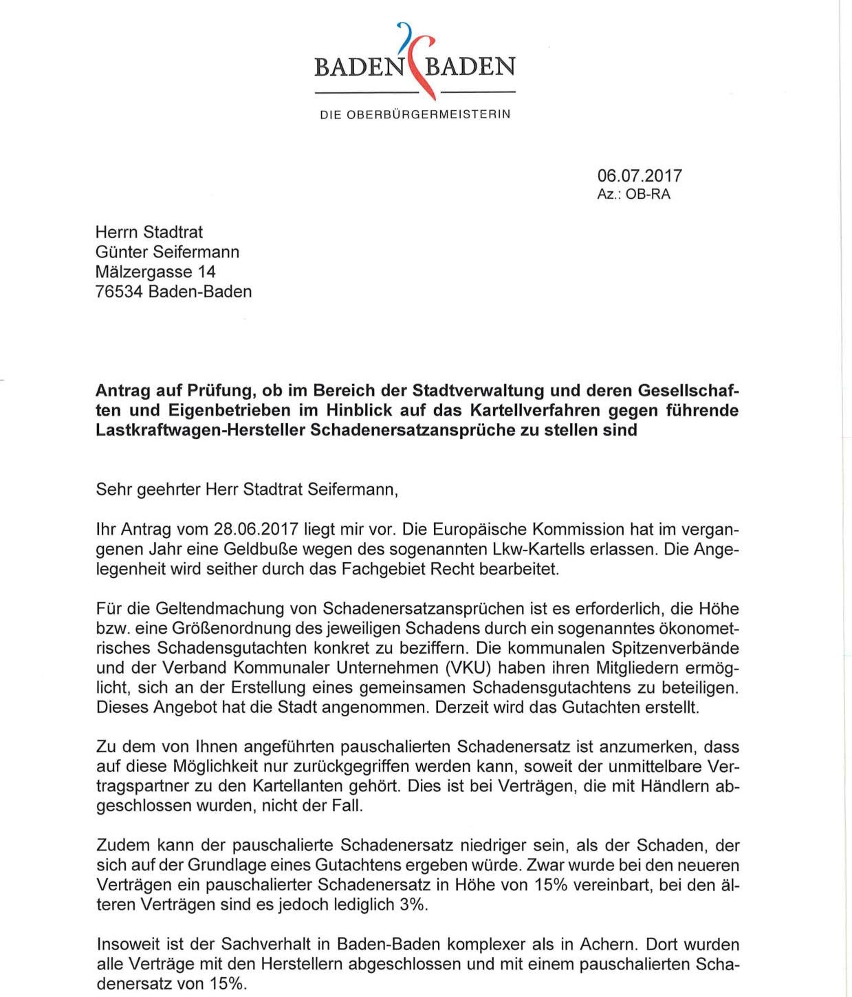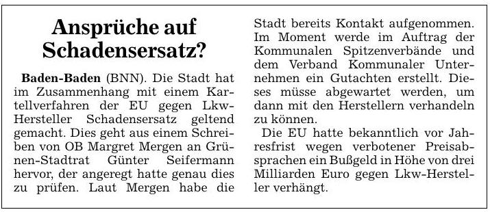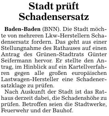 Stadtrat Günter Seifermann forderte die Stadtverwaltung in einem Schreiben auf, Schadensersatzforderungen für von der Stadt gekaufte Fahrzeuge zu prüfen. In einem Antwortschreiben des Baden-Badener Rathauses an Stadtrat Günter Seifermann heißt es unter anderem: «Zu dem von Ihnen angeführten pauschalierten Schadensersatz ist anzumerken, dass auf diese Möglichkeit nur zurückgegriffen werden kann, soweit der unmittelbare Vertragspartner zu den Kartellanten gehört. Dies ist bei Verträgen mit Händlern nicht der Fall.»
