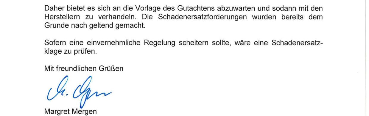 ich komme zurück auf Ihre Anfrage in der Sitzung des Hauptausschusses am 09.07.2018. Wie Ihnen Herr Eble in der Sitzung schon mitgeteilt hatte, liegen von den kartellbetroffenen Unternehmen Einredeverzichtserklärungen vor, so dass Schadenersatzansprüche nicht verjähren können und das weitere Vorgehen geprüft werden kann.